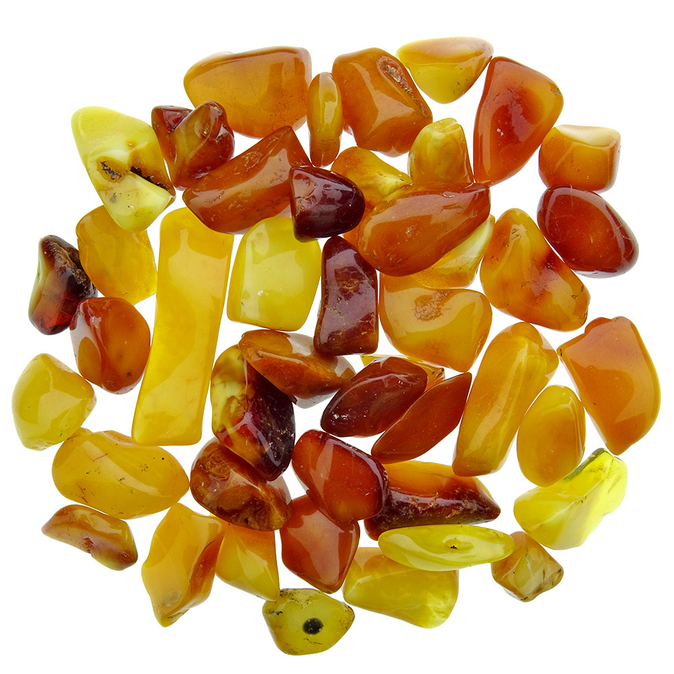 Die meisten dieser polierten Bernsteine sind zwischen 1 und 2 cm groß. Gelegentlich gibt es ein größeres oder kleineres Exemplar dazwischen