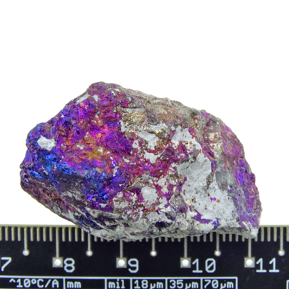 Durch die Oxidation von Eisen und Kupfer in diesem Mineral kann der Stein schöne blaue, violette oder rote Farben annehmen. Bornit wird wegen seines Farbspiels auch als "Pauwenerts" bezeichnet. Im Gegensatz zu einigen Berichten ist Bornite absolut nicht radioaktiv! Bornit kann beim Erhitzen magnetisch gemacht werden.