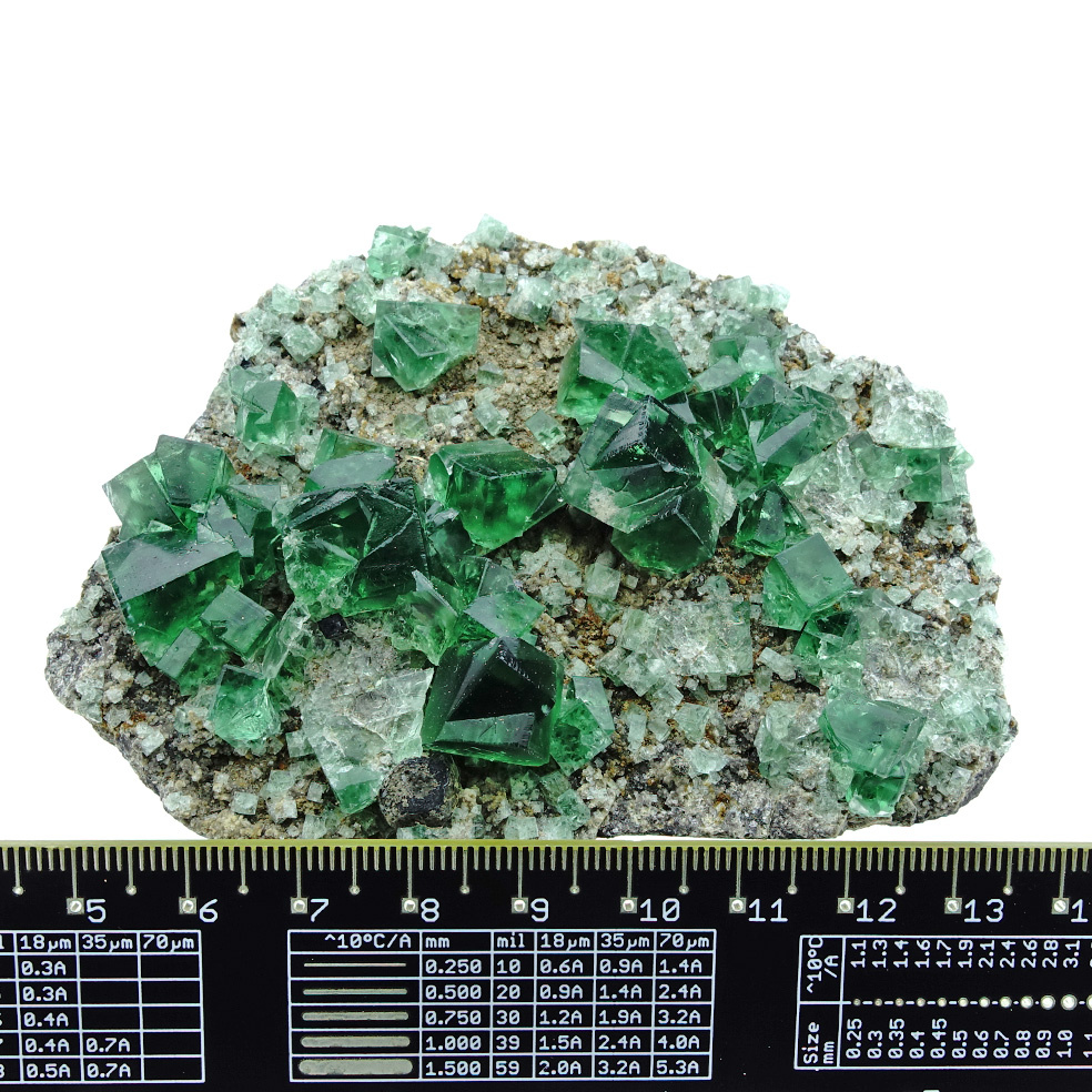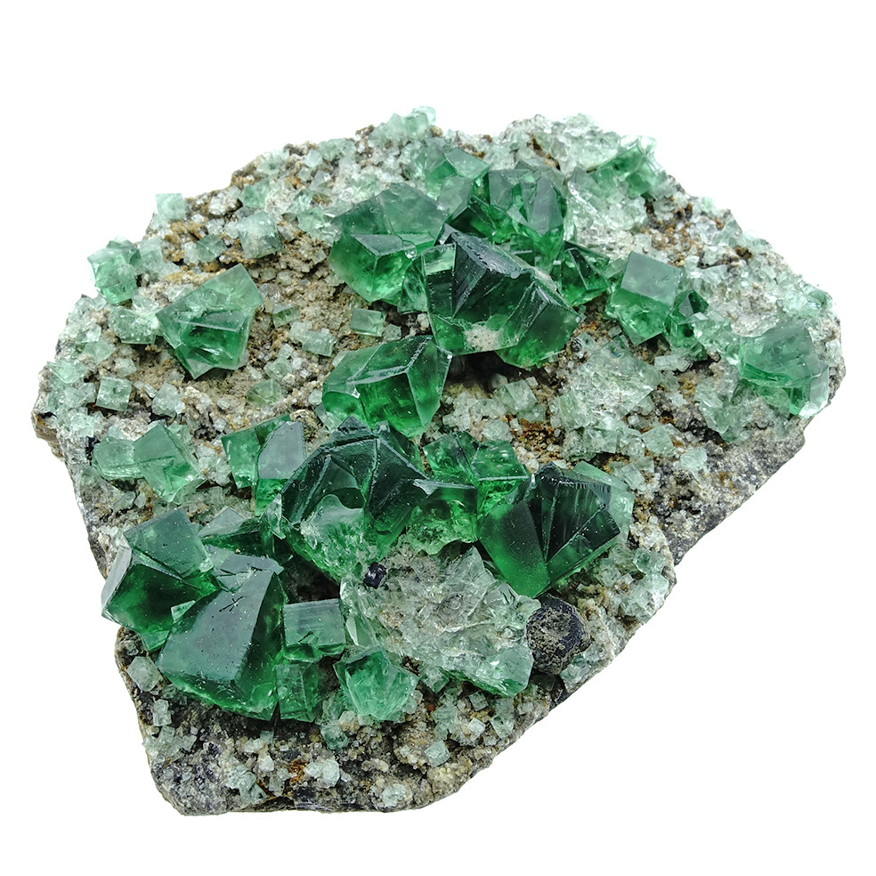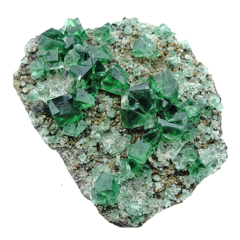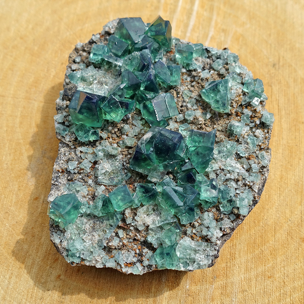 Prachtiger Fluorit aus der 'Greedy Hog'-Pocket in der Diana Marian Mine in Co. Durham, England. Dieser Fluorit zeichnet sich durch klare grüne Fluoritkristalle aus, die einen violetten Schimmer zeigen, sobald sie dem Tageslicht ausgesetzt werden. Bemerkenswert sind sowohl die einzelnen Kristalle als auch die Zwillingskristalle, die sich schön individuell gebildet haben. Ein Bild sowohl im Tageslicht als auch im Kunstlicht!