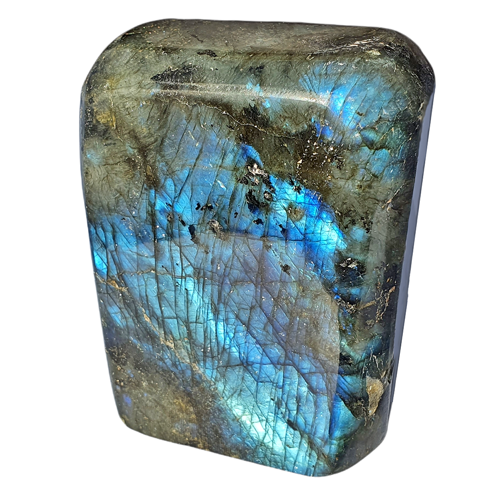Labradorit wurde erstmals 1780 auf der Labrador-Halbinsel in Kanada entdeckt. Es ist ein grauer Stein, der beim Drehen schöne Farbnuancen in Gelb, Grün und Blau zeigt. Dieses Farbspiel wird durch eine innere Lamellenstruktur verursacht, oft in Kombination mit kleinen spiegelnden Einschlüssen von Rutil und Magnetit. Dieser Stein gehört zur Familie der Feldspat.