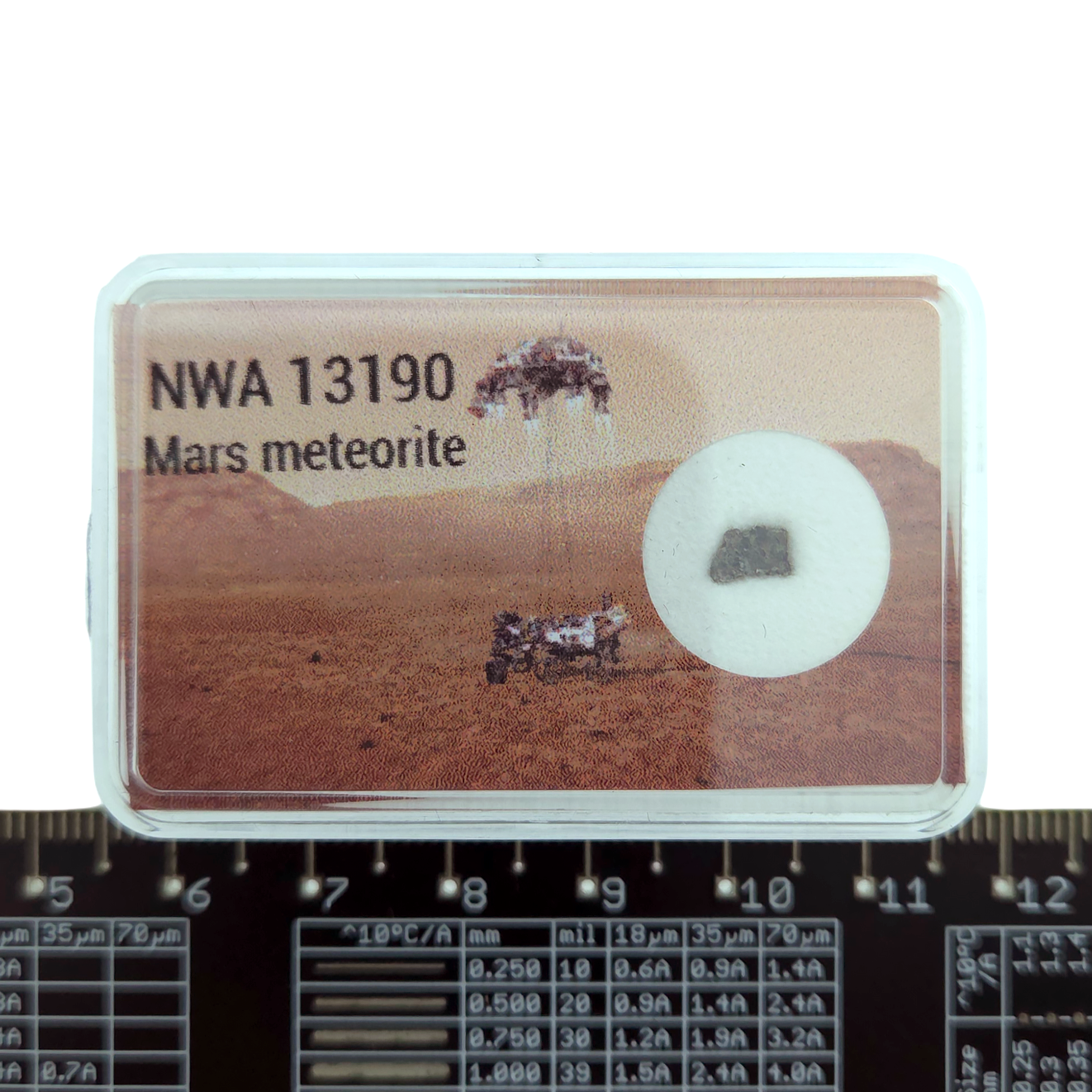 NWA 13190 ist ein basaltischer Marsmeteorit mit dunklem, kristallinem Erscheinungsbild. Dieses Material entstand aus erstarrter Lava auf dem Mars und gelangte nach einem gewaltigen Einschlag auf die Erde. Ein reines und gut erkennbares Stück Marsgestein.