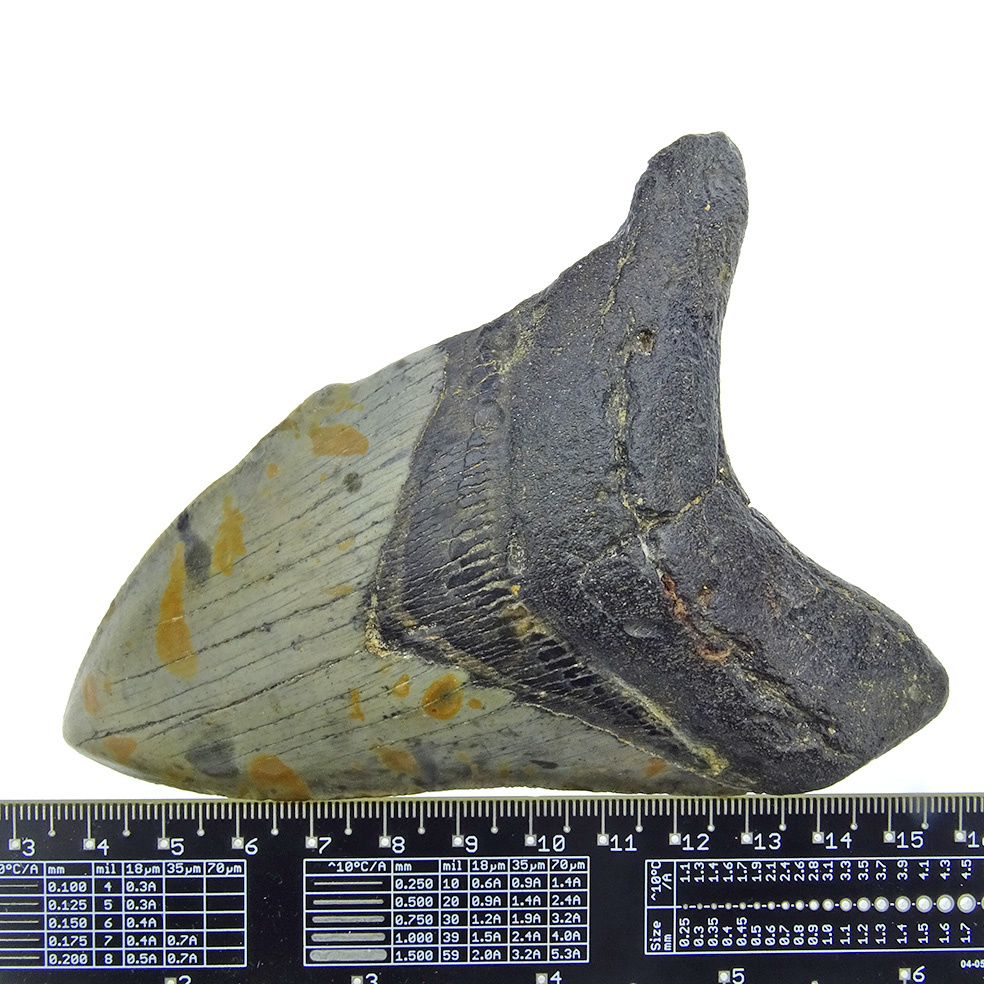 Der Megalodon-Hai wurde in allen großen Ozeanen gefunden. Dieser Zahn wurde im Edisto River in South Carolina, USA, gefunden. Der Fluss ist bekannt für seinen Reichtum an Fossilien, insbesondere Megalodon-Zähnen.