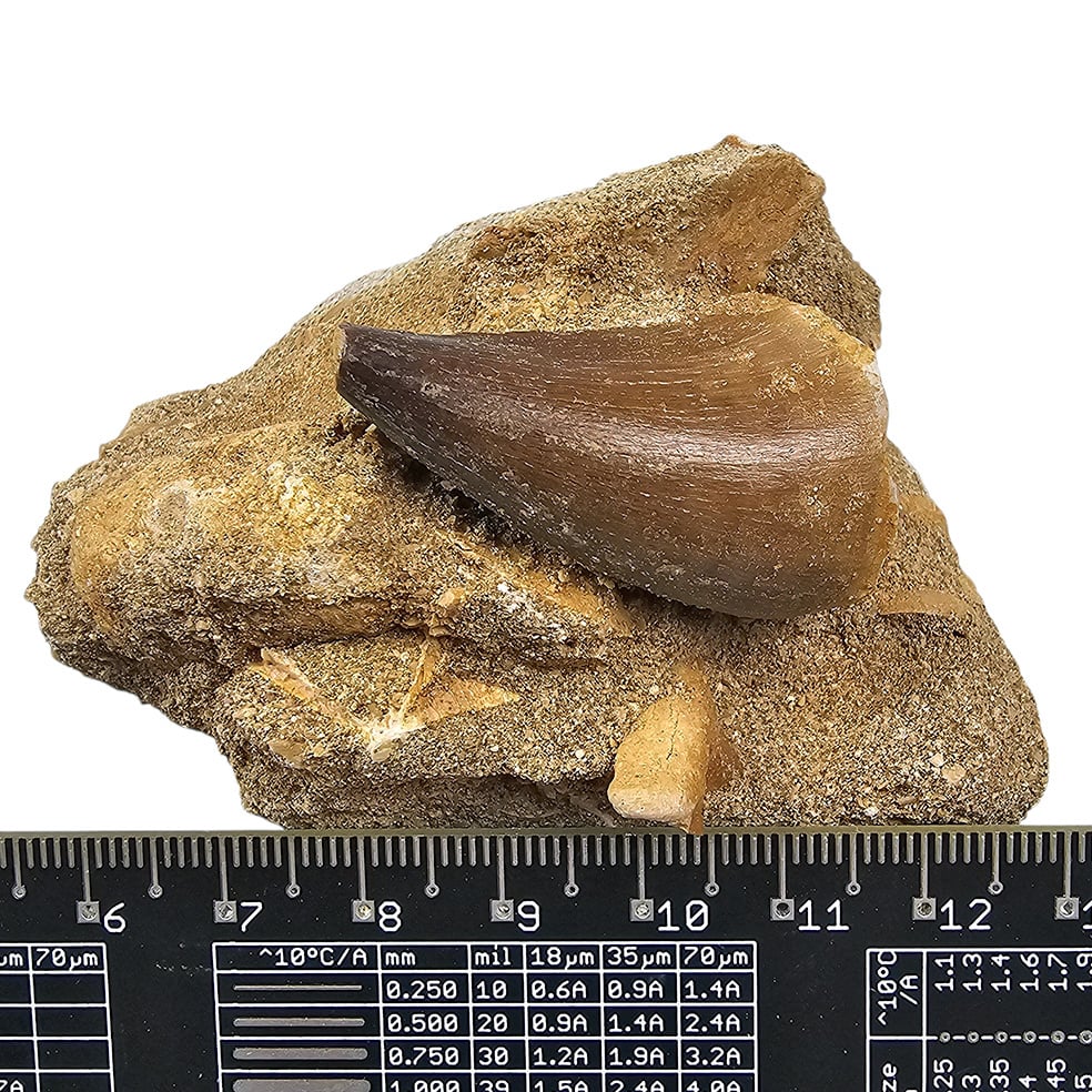 Der Mosasaurus ist ein Saurier, der in der späten Kreidezeit (vor 71,3 bis 65,4 Millionen Jahren) die Meere bewohnte. Die ersten fossilen Überreste des Mosasaurus wurden in der Nähe von Maastricht gefunden. Der Mosasaurus ist daher nach der Maas benannt und wird auf Niederländisch auch Maas-Eidechse genannt. Dieser Zahn wurde in den Phosphatminen in Marokko gefunden.