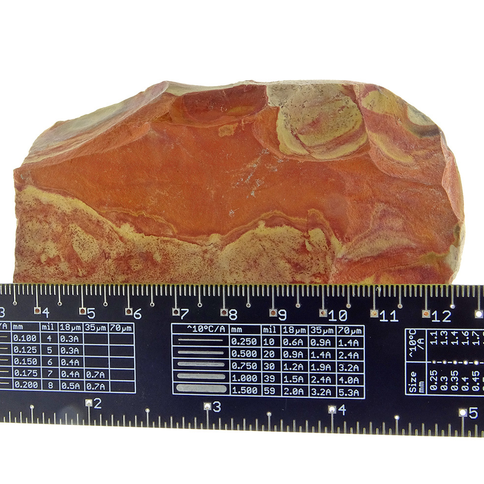 Jaspis ist eine undurchsichtige Sorte von Quarz und Achat. Aufgrund der porösen Struktur kann Jaspis viele Fremdstoffe aufnehmen, was auch die enorme Farbvielfalt erklärt, die Jaspis haben kann. Dieser polychrome Jaspis ist auf einer Seite poliert, die andere Seite ist rau.