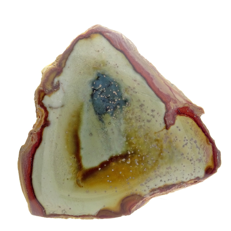 Jaspis ist eine undurchsichtige Sorte von Quarz und Achat. Aufgrund der porösen Struktur kann Jaspis viele Fremdstoffe aufnehmen, was auch die enorme Farbvielfalt erklärt, die Jaspis haben kann. Dieser polychrome Jaspis ist auf einer Seite poliert, die andere Seite ist rau.