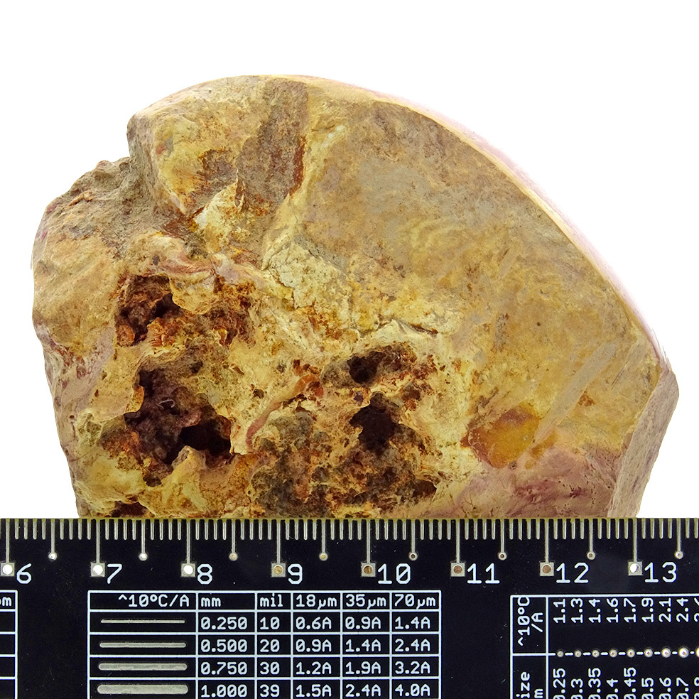 Jaspis ist eine undurchsichtige Sorte von Quarz und Achat. Aufgrund der porösen Struktur kann Jaspis viele Fremdstoffe aufnehmen, was auch die enorme Farbvielfalt erklärt, die Jaspis haben kann. Dieser polychrome Jaspis ist auf einer Seite poliert, die andere Seite ist rau.