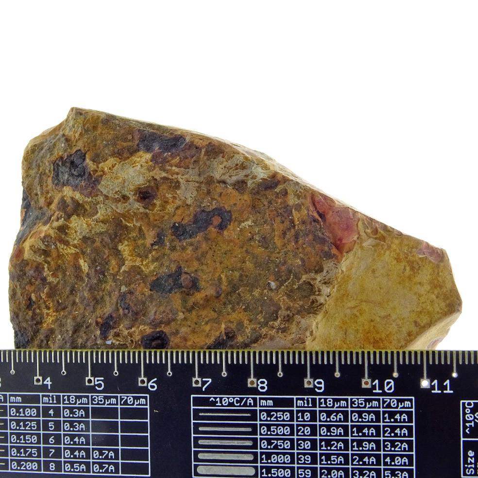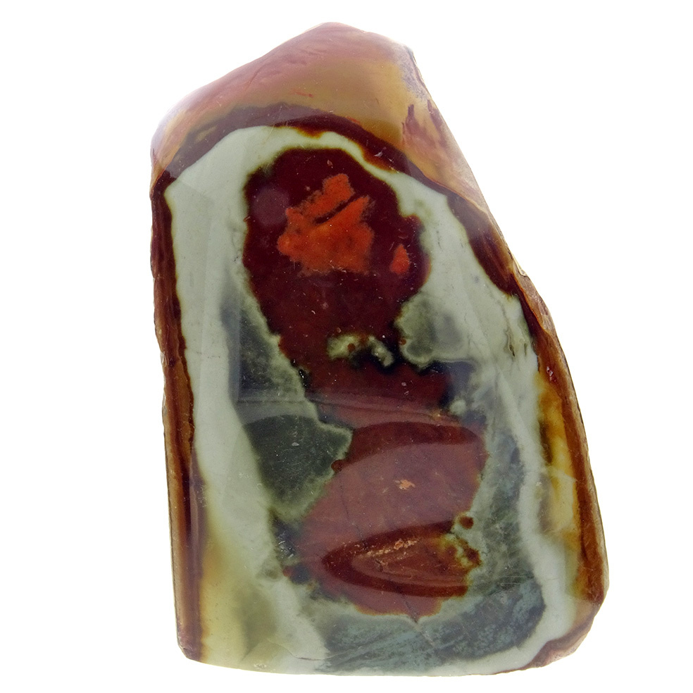 Jaspis ist eine undurchsichtige Sorte von Quarz und Achat. Aufgrund der porösen Struktur kann Jaspis viele Fremdstoffe aufnehmen, was auch die enorme Farbvielfalt erklärt, die Jaspis haben kann. Dieser polychrome Jaspis ist auf einer Seite poliert, die andere Seite ist rau.