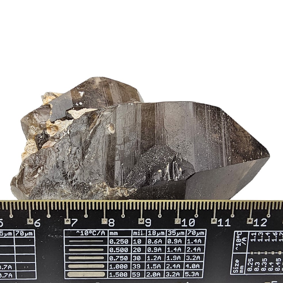 Diese besonderen Rauchquarzkristalle aus Mt. Malosa zeichnen sich durch ihre tiefdunkle Farbe und das Vorhandensein von Aegirin aus. Die dunkle Farbe ist auf das Vorhandensein von Aluminium im Kristall zurückzuführen, das den Kristallen, nachdem sie ionisierender Strahlung ausgesetzt wurden, ihren charakteristischen Farbton verleiht. Dieser Prozess kann Tausende von Jahren dauern.