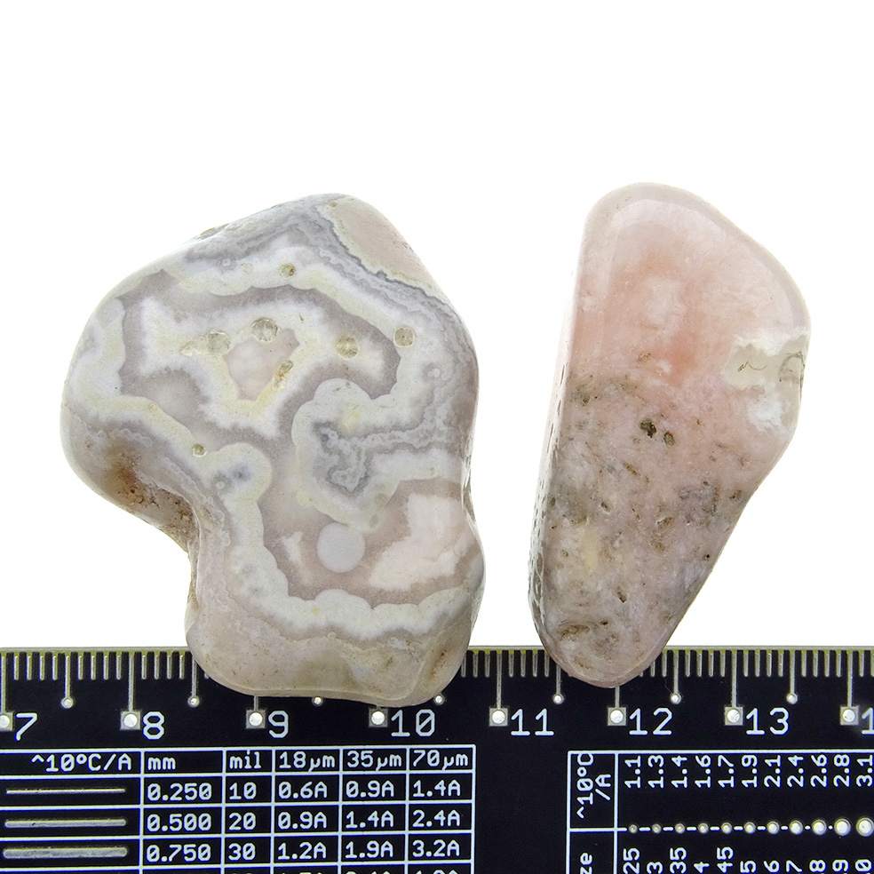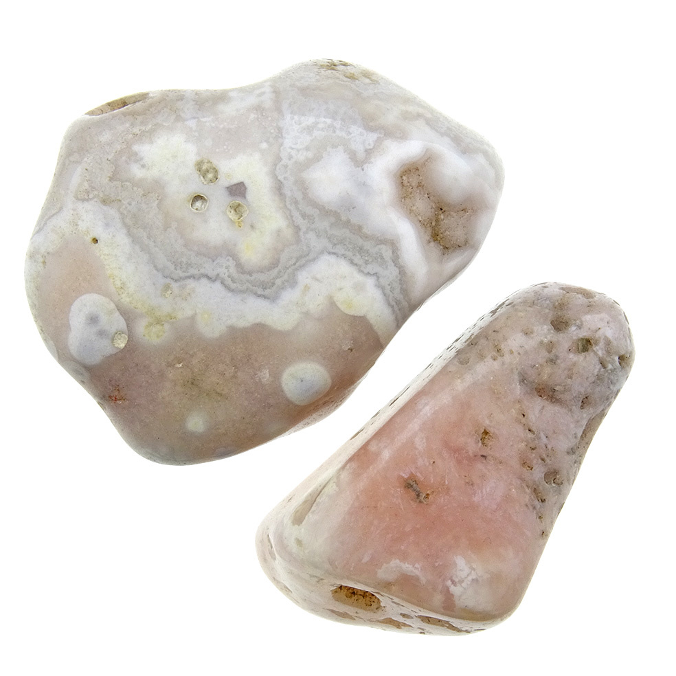 Rosa Amethyst Trommelsteinen aus Brasilien. Die Hämatitverbindungen im Chalzedon sorgen für die rosafarbene Farbe.