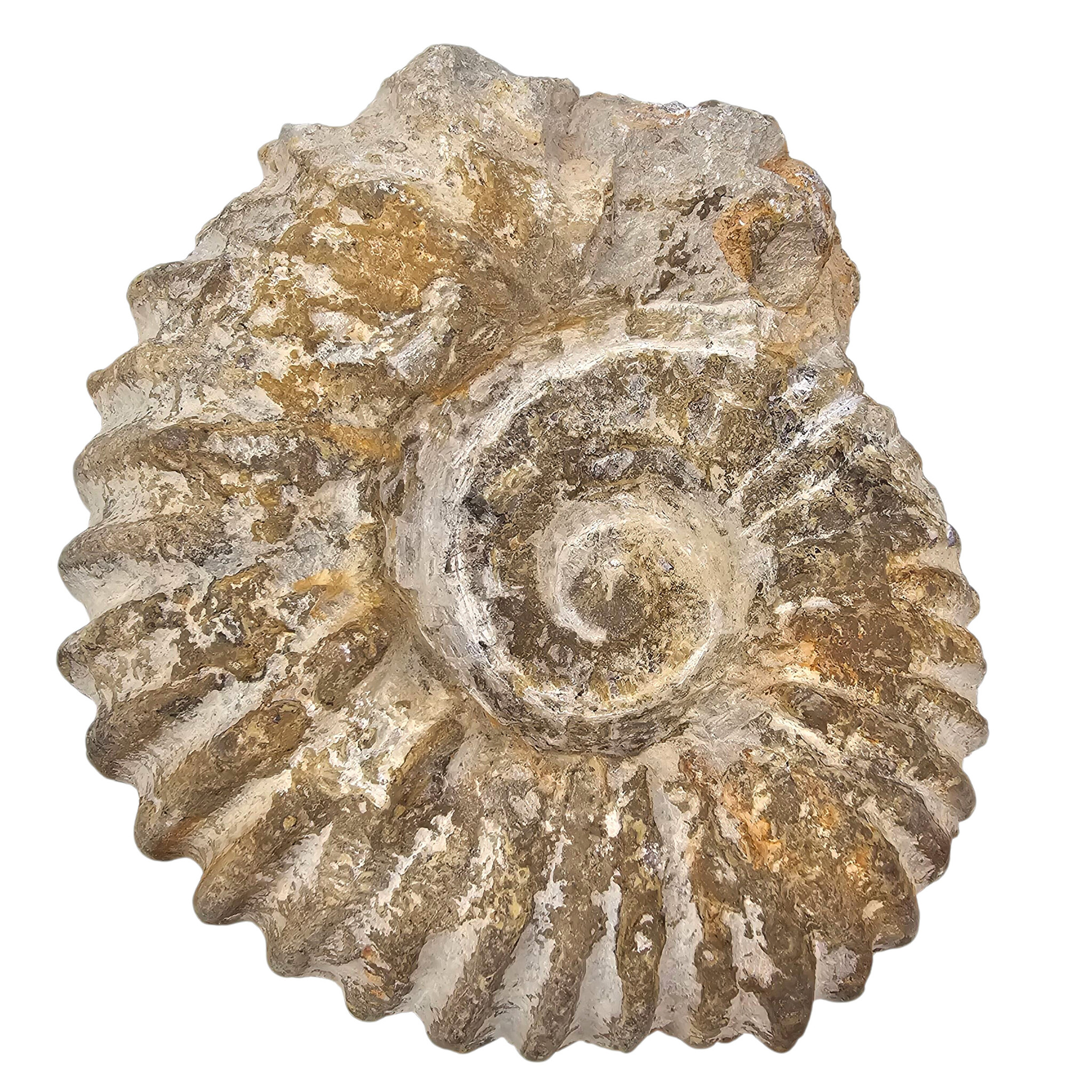 Fossilized ammonite from Morocco, dating back to the Cretaceous period. These spiral-shaped fossils are millions of years old and are beloved by collectors and natural history enthusiasts.