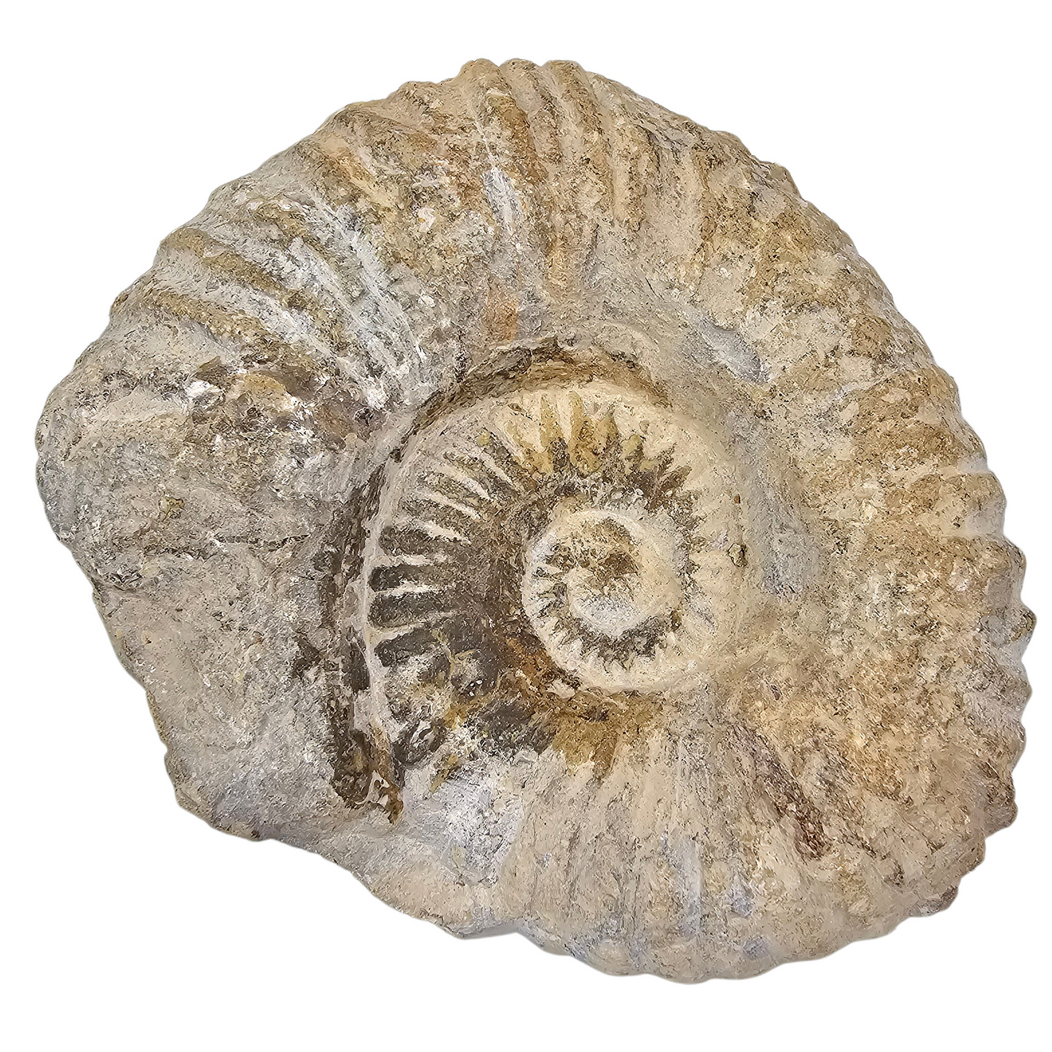 The shell of an ammonite was usually spiral-shaped and consisted of chambers. When the animal died, the shell could be covered by sediment, and over millions of years, fossilization occurred. During this process, organic material was replaced by minerals such as calcite or pyrite, depending on the conditions.