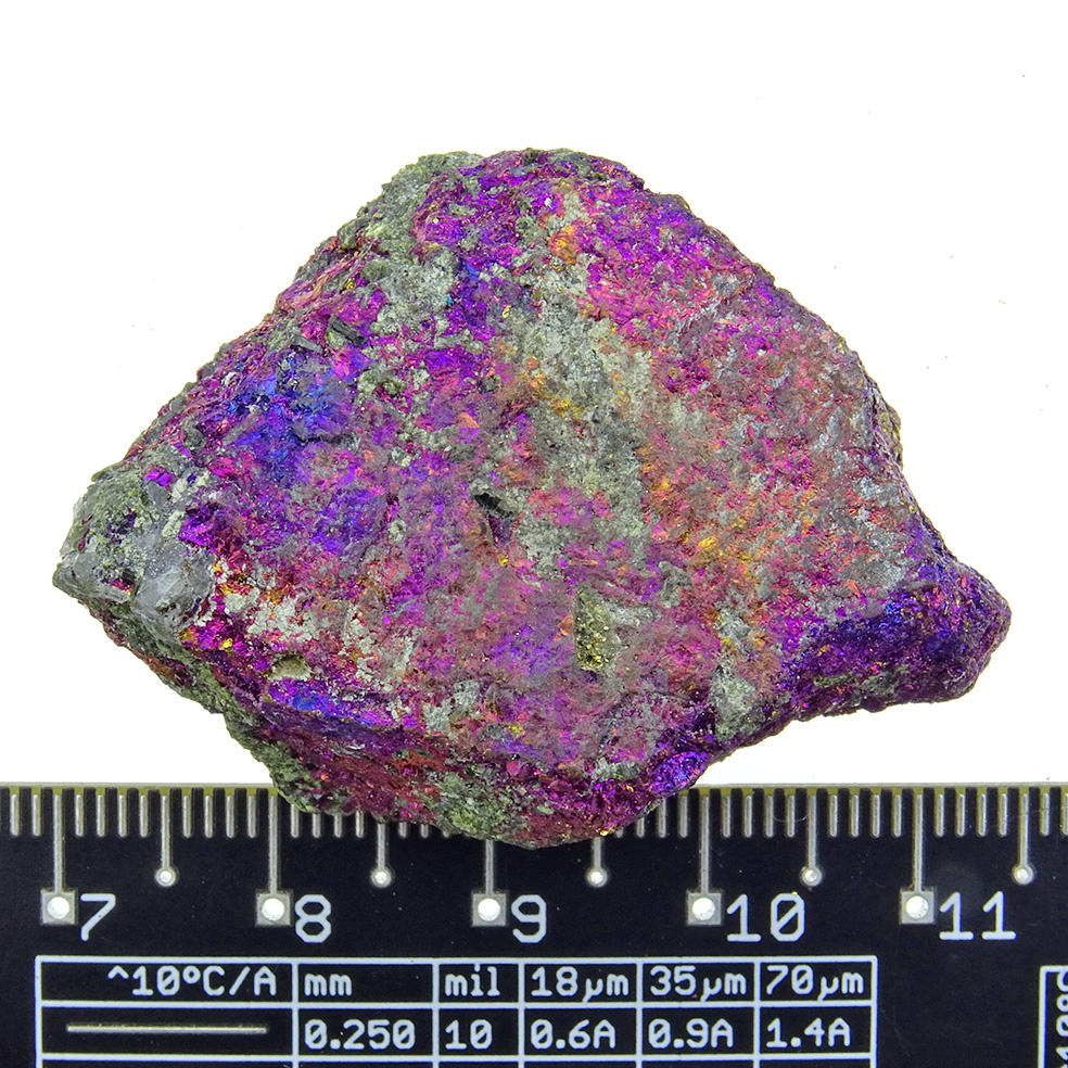 Due to oxidation of the iron and copper in this mineral, the stone can take on beautiful blue, purple or red colors. Bornite is also referred to as 'Pauwenerts' because of its color play. Contrary to some reports, Bornite is absolutely not radioactive! Bornite can be made magnetic when heated.
