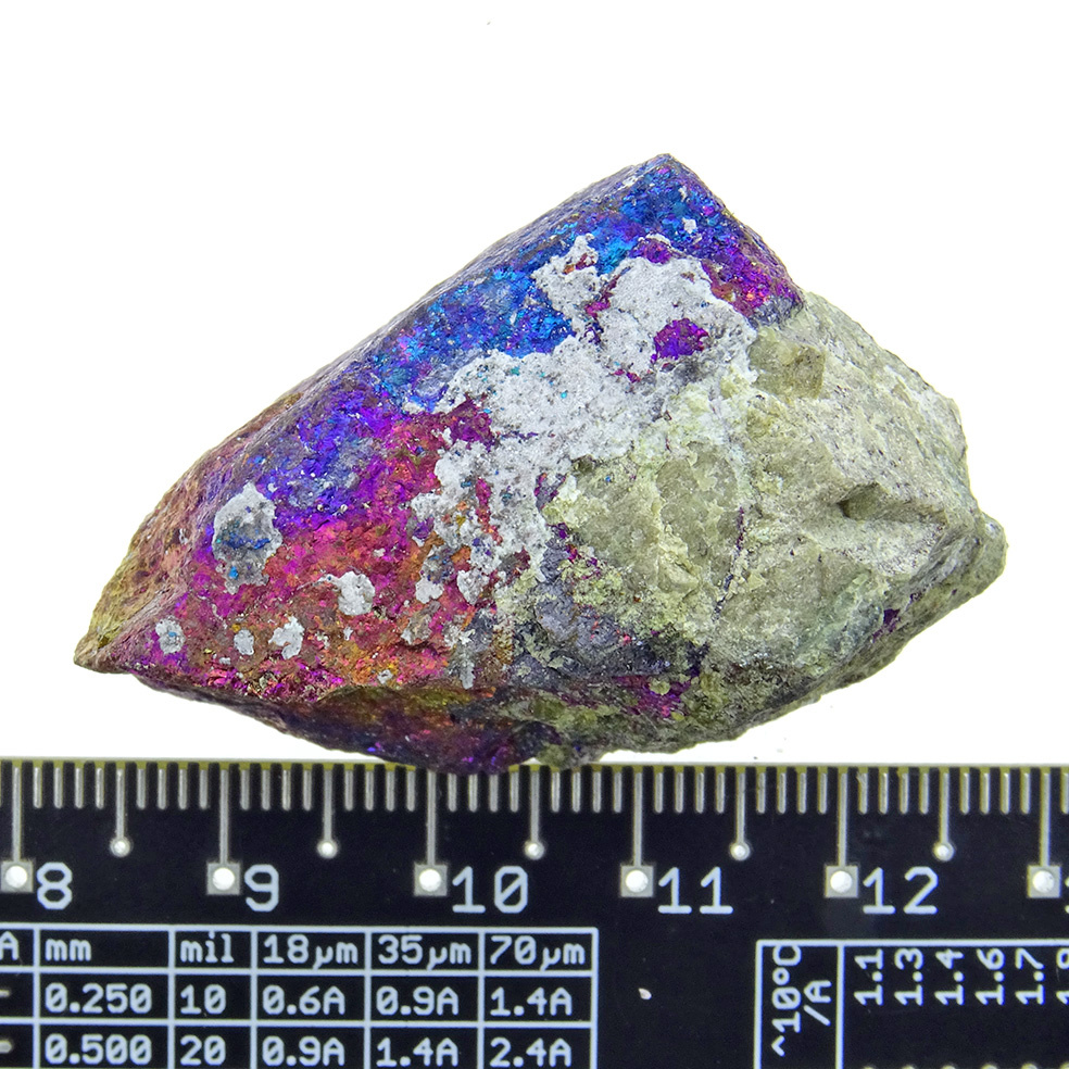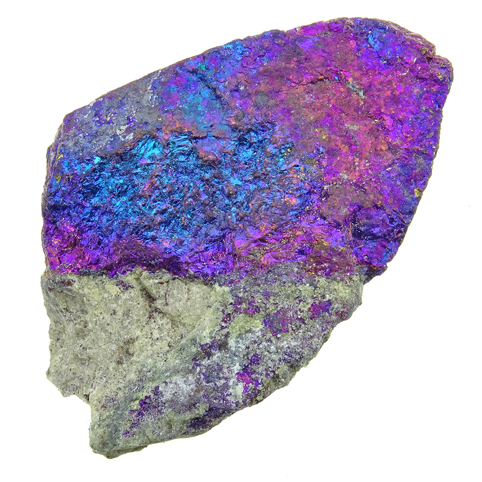 Due to oxidation of the iron and copper in this mineral, the stone can take on beautiful blue, purple or red colors. Bornite is also referred to as 'Pauwenerts' because of its color play. Contrary to some reports, Bornite is absolutely not radioactive! Bornite can be made magnetic when heated.