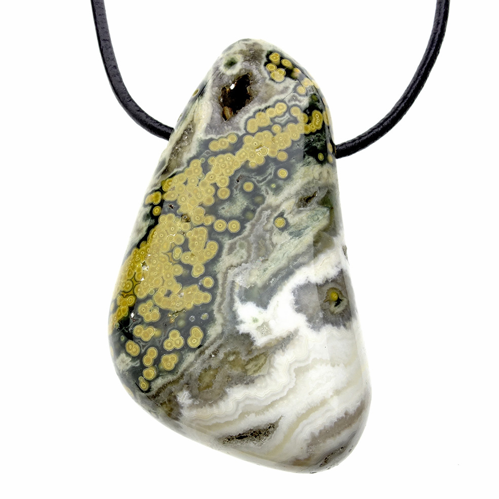 Ocean Jasper is found exclusively in Madagascar. The stone is characterized by its many different colors and spherical patterns.
