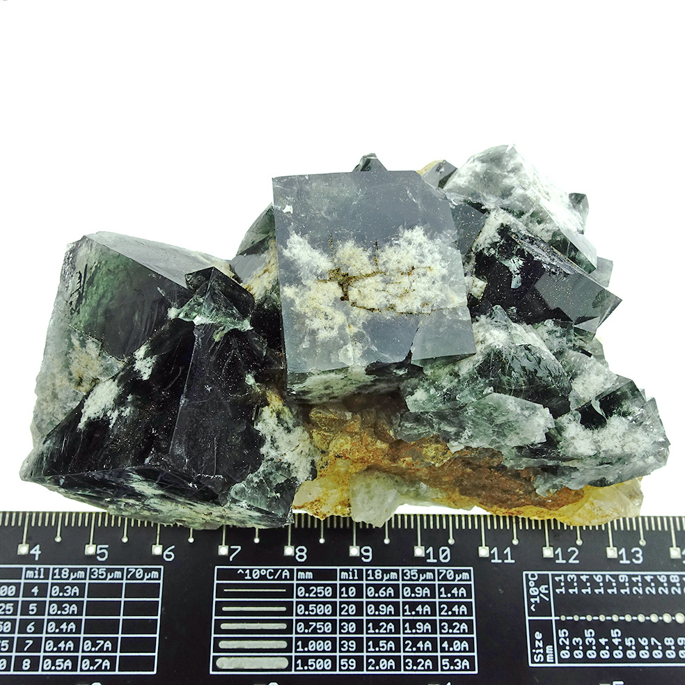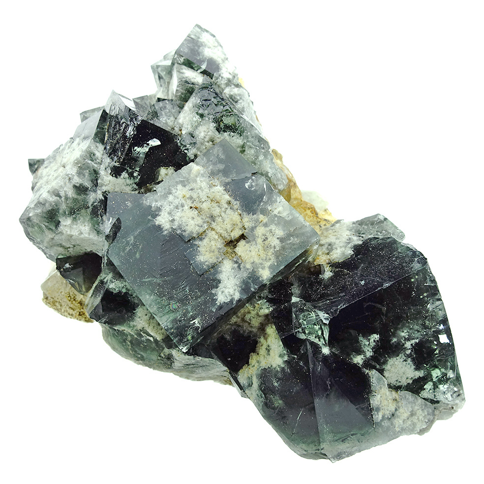 Beautiful fluorite from the 'Milky Way' pocket in the Diana Maria mine in Co. Durham, England. This fluorite is characterized, just like the 'Super Nova' fluorite, by the dark green with white fluorite crystals that give the whole an astronomical appearance. Spectacular is the color change in daylight: these crystals change color entirely from dark green to deep purple, even with very little light! A picture in both daylight and artificial light!
