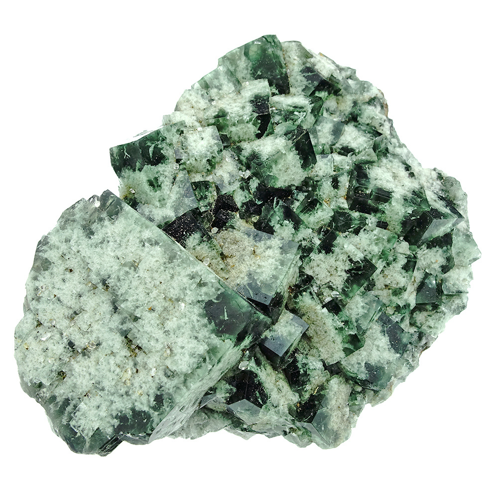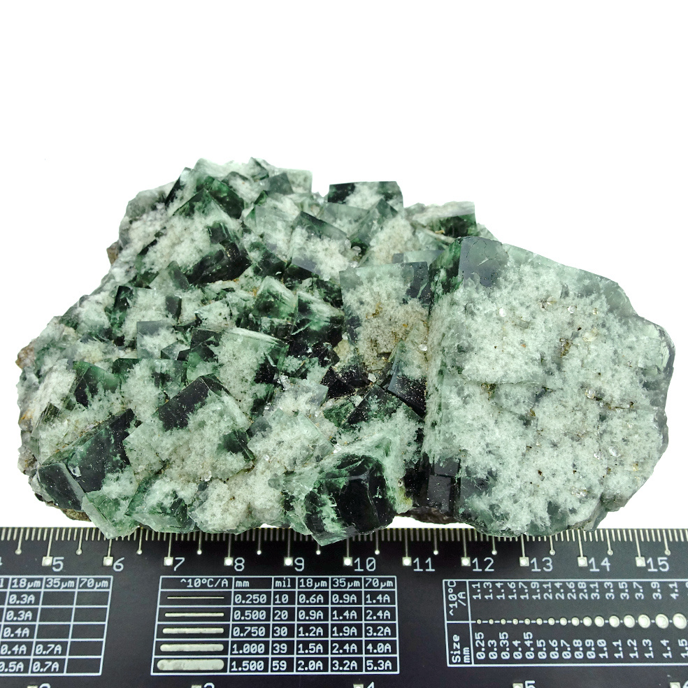Beautiful fluorite from the 'Milky Way' pocket in the Diana Maria mine in Co. Durham, England. This fluorite is characterized, just like the 'Super Nova' fluorite, by the dark green with white fluorite crystals that give the whole an astronomical appearance. Spectacular is the color change in daylight: these crystals change color entirely from dark green to deep purple, even with very little light! A picture in both daylight and artificial light!