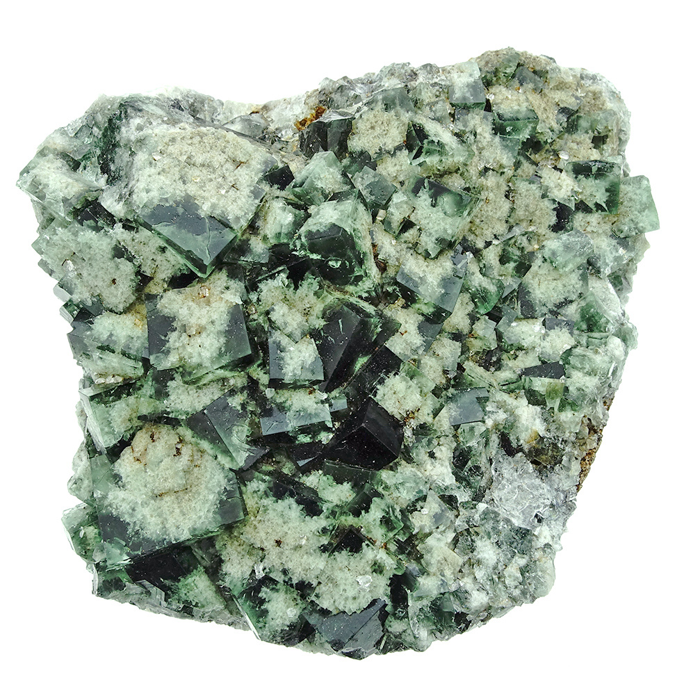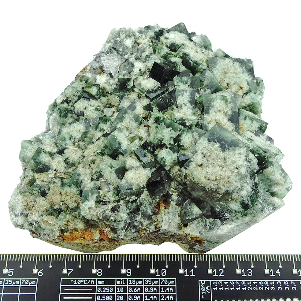 Beautiful fluorite from the 'Milky Way' pocket in the Diana Maria mine in Co. Durham, England. This fluorite is characterized, just like the 'Super Nova' fluorite, by the dark green with white fluorite crystals that give the whole an astronomical appearance. Spectacular is the color change in daylight: these crystals change color entirely from dark green to deep purple, even with very little light! A picture in both daylight and artificial light!