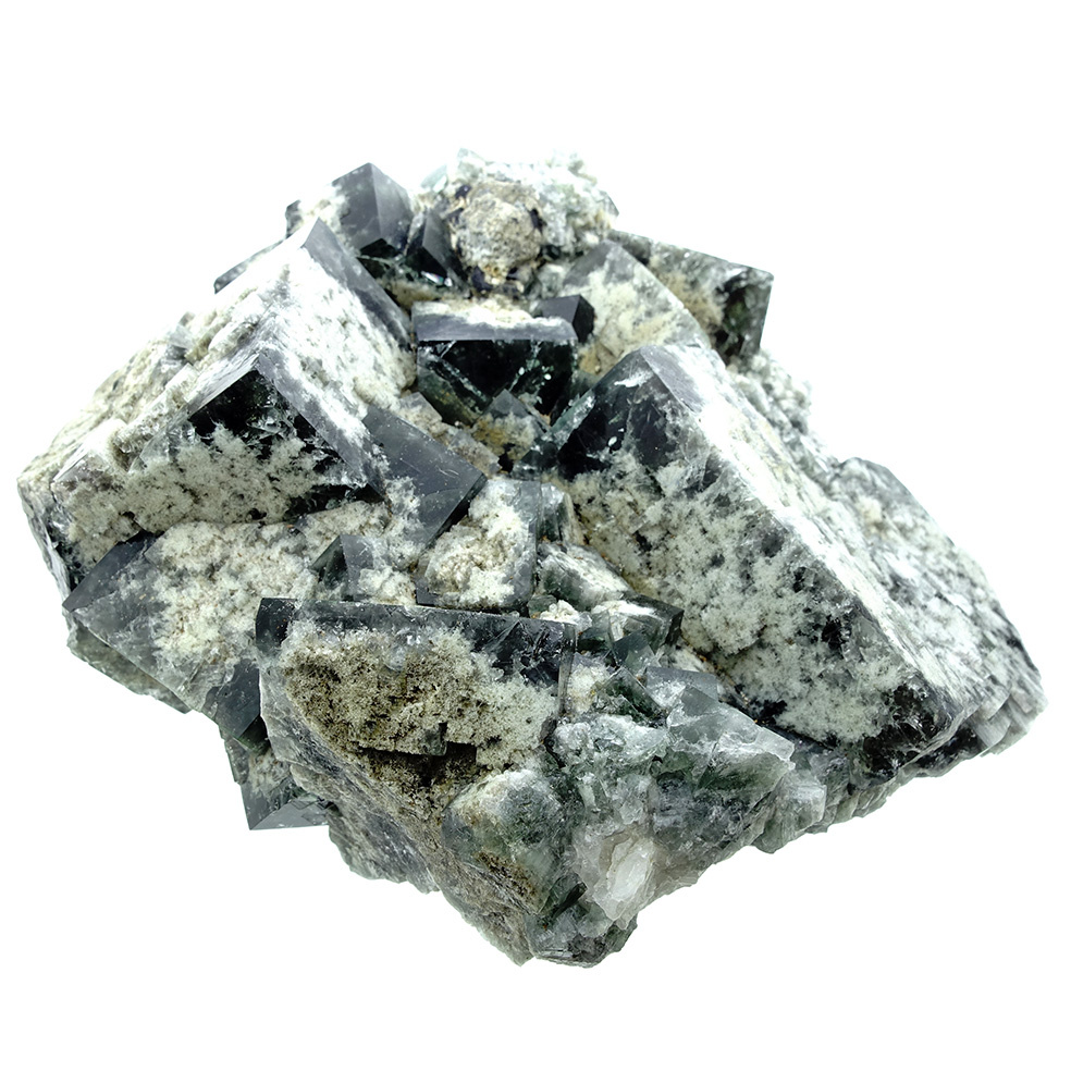 Stunning fluorite from the 'Supernova' pocket in the Diana Marian mine in Co. Durham, England. This fluorite is characterized by its dark green with white fluorite crystals that give the whole an astronomical appearance. Spectacular is the color change in daylight: these crystals completely change from dark green to deep purple, even with very little light! A sight to behold in both daylight and artificial light!