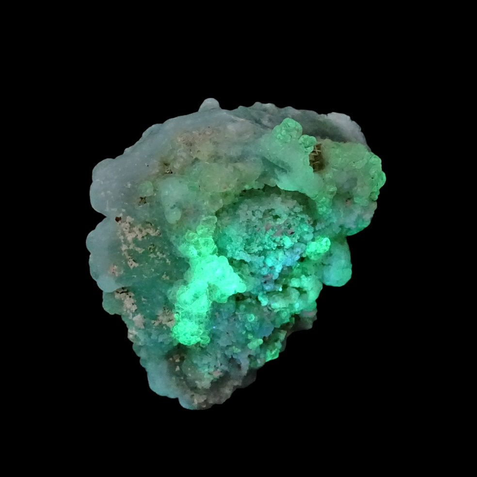 Hyalite opal is a not very common variant of an already rare gemstone. It looks like transparent glass spheres and comes to life in bright green under a shoirt wave UV light. The name Hyalite is derived from the Greek word 'hialos' meaning glass. The green fluorescence is due to the presence of uranium, which is fortunately well encapsulated and, with its low value, poses no danger.