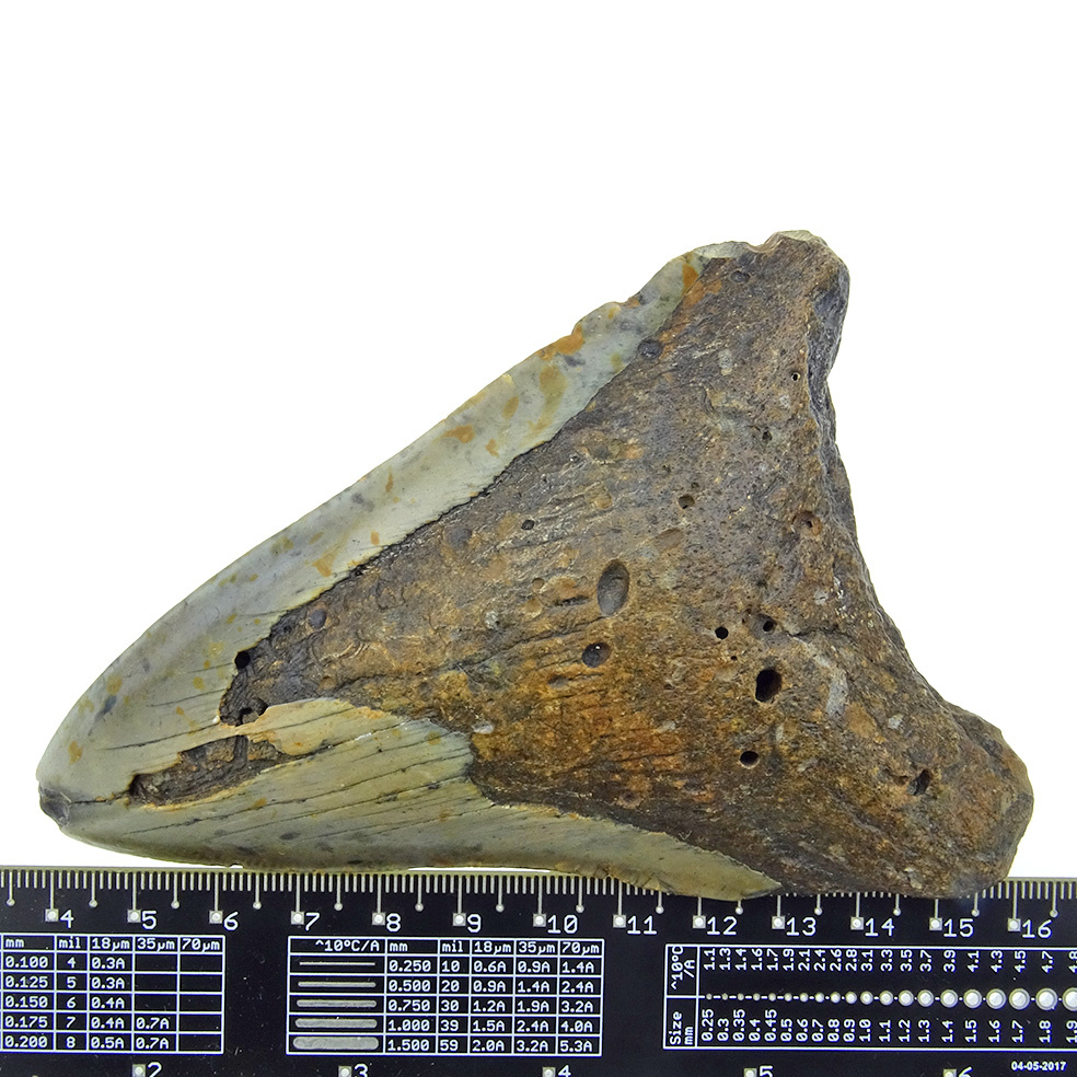 The Megalodon shark was found in all the major oceans. This tooth was found in the Edisto River in South Carolina, USA. The river is known for its wealth of fossils, particularly Megalodon teeth.