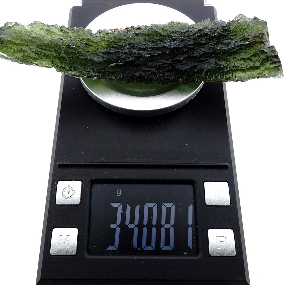 This moldavite weighs 34 grams. It is undamaged and of museum quality.