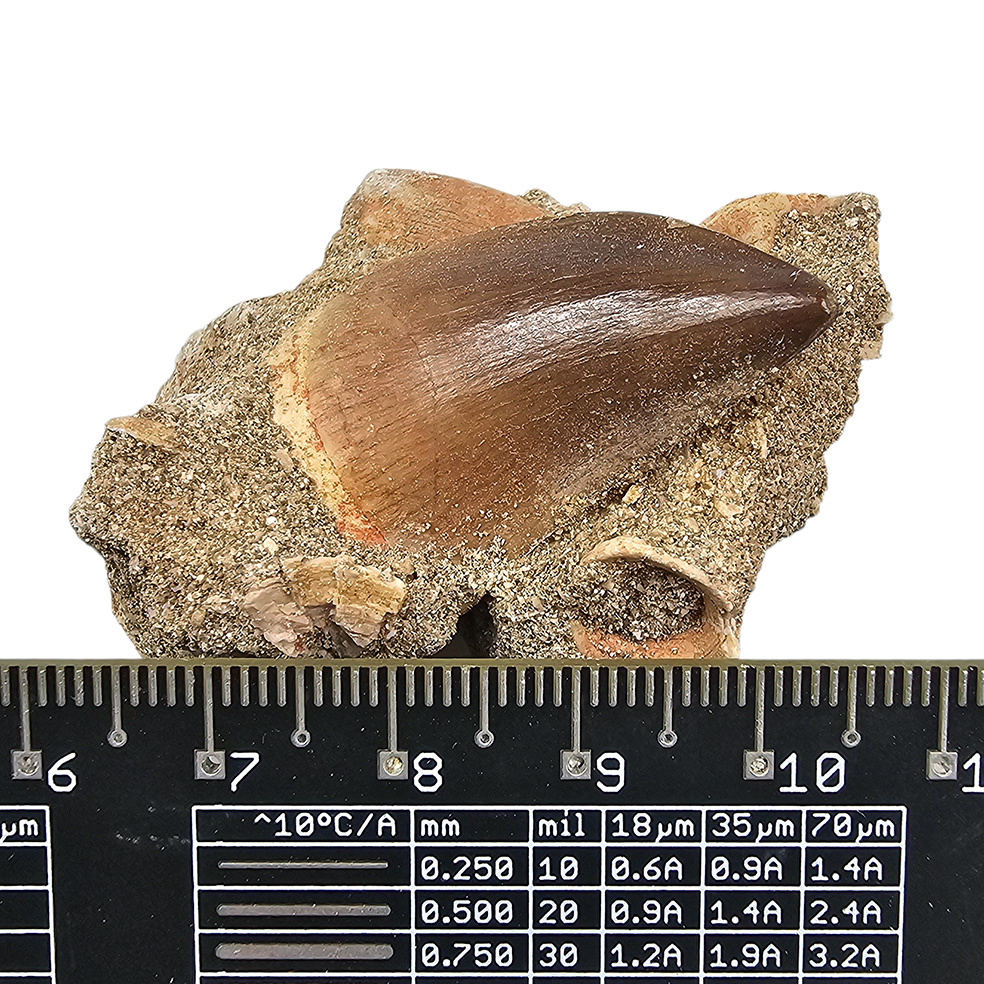 A beautiful tooth of the Mosasaurus, a saurian that inhabited the seas in the late Cretaceous (71.3-65.4 million years ago).
