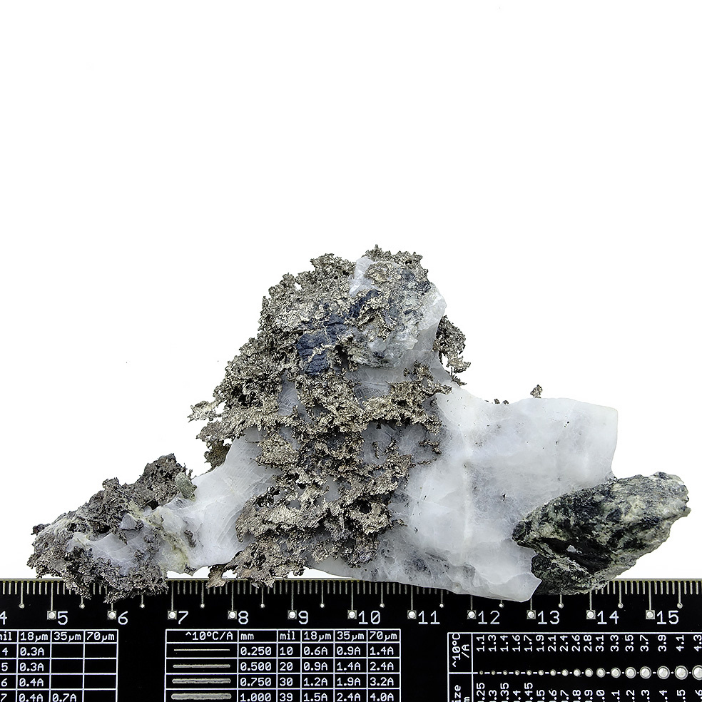 These native silver crystals originate from the Bouismas Mine in the Zagora Province of Morocco. Here they are found on calcite, a common mineral that makes up part of the rock formation in which the silver crystals formed. The crystals form a beautiful dendritic pattern, meaning they branch out like a plant or a tree. This unique pattern was revealed by etching away some of the surrounding calcite, exposing the embedded silver crystals.