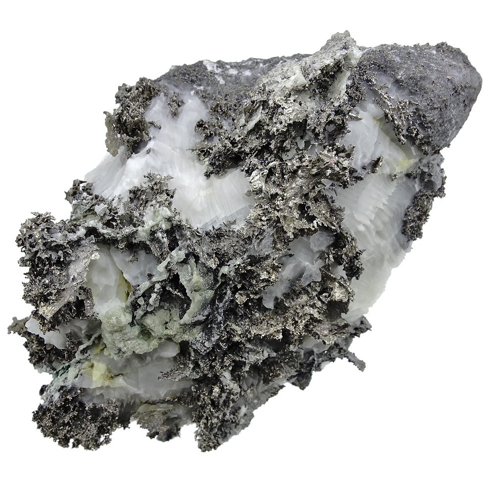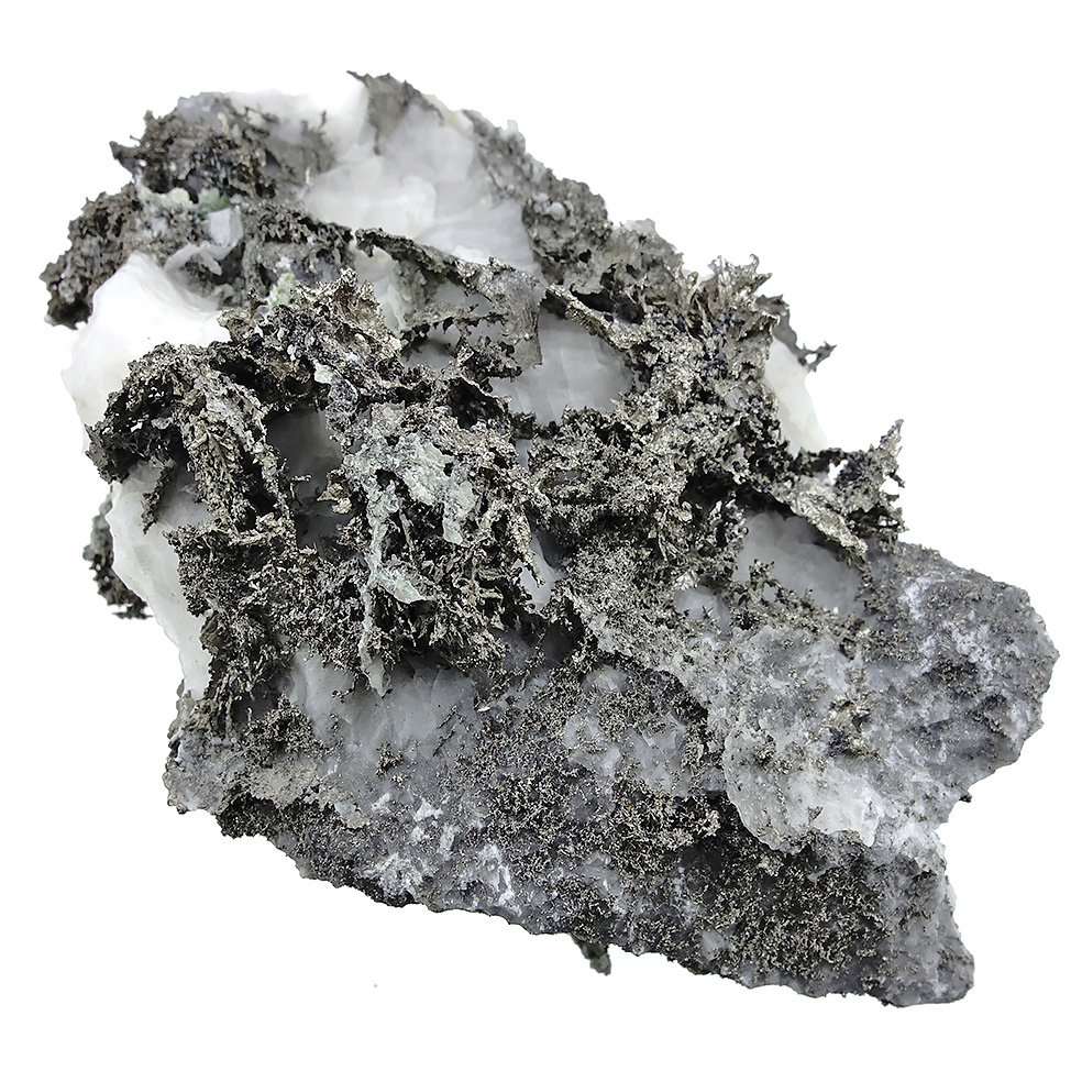 These native silver crystals originate from the Bouismas Mine in the Zagora Province of Morocco. Here they are found on calcite, a common mineral that makes up part of the rock formation in which the silver crystals formed. The crystals form a beautiful dendritic pattern, meaning they branch out like a plant or a tree. This unique pattern was revealed by etching away some of the surrounding calcite, exposing the embedded silver crystals.