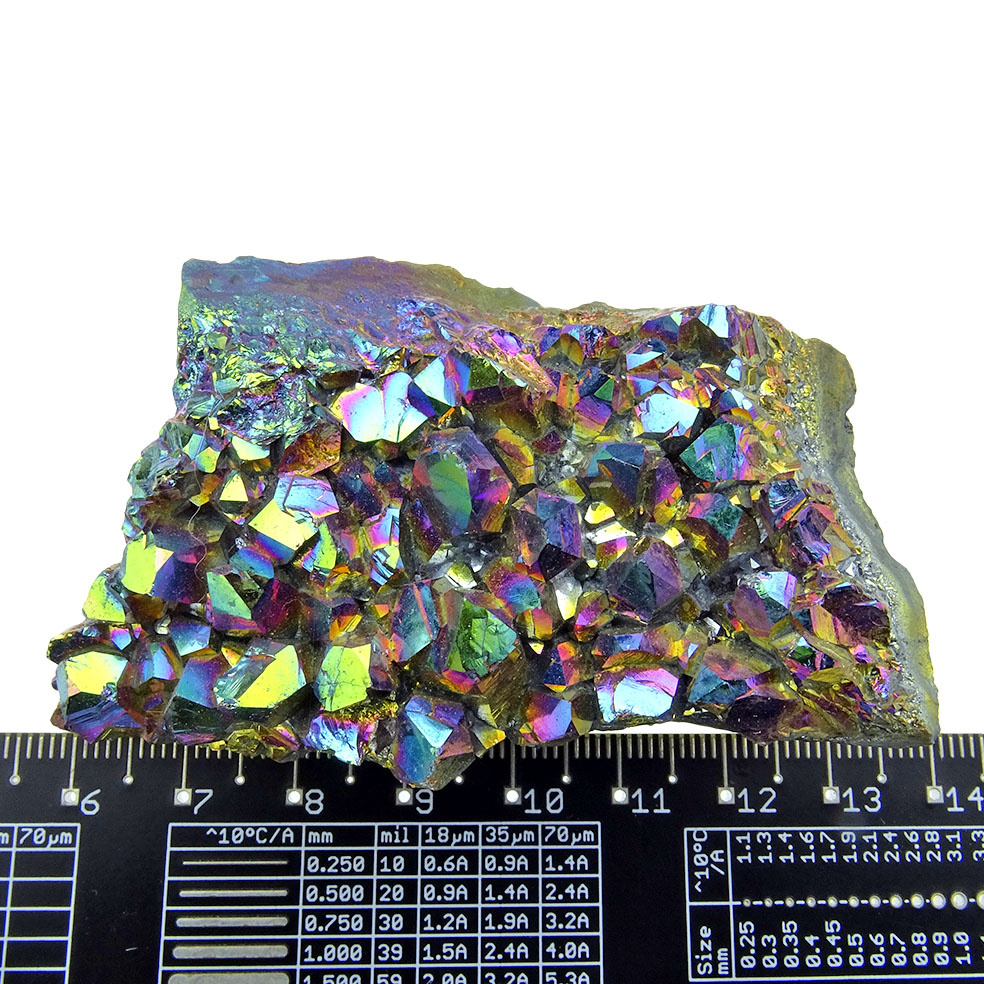 A rainbow aura crystal is a crystal with a colored tint. This is obtained by treating the crystal with a gold infusion. This is done in a vacuum chamber at a temperature of 871°C. Gold vapor is added to the chamber and the atoms fuse together with the surface of the crystal for a beautiful iridescent metallic sheen. This rainbow aura is an amethyst crystal.