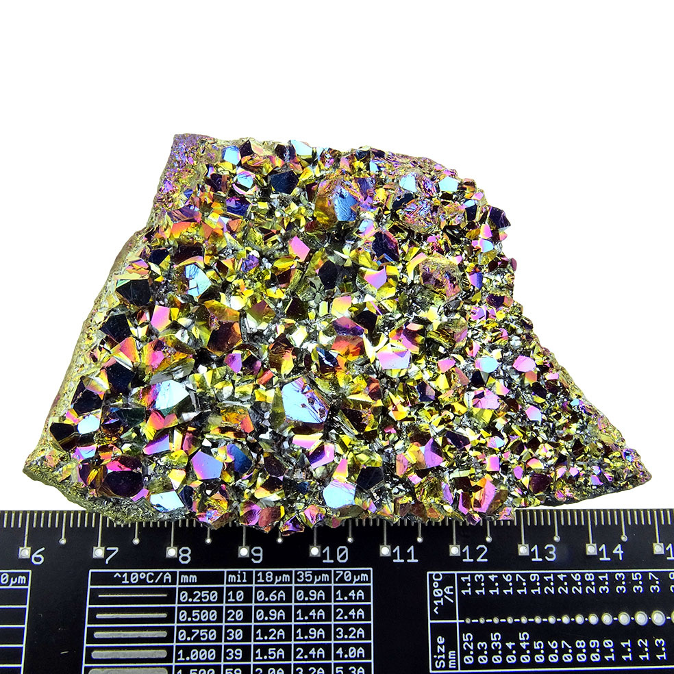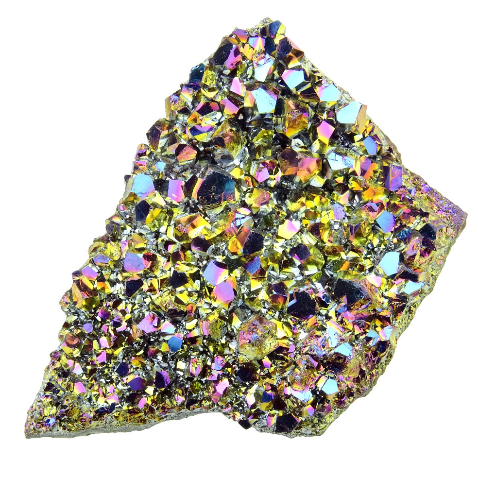 A rainbow aura crystal is a crystal with a colored tint. This is obtained by treating the crystal with a gold infusion. This is done in a vacuum chamber at a temperature of 871°C. Gold vapor is added to the chamber and the atoms fuse together with the surface of the crystal for a beautiful iridescent metallic sheen. This rainbow aura is an amethyst crystal.