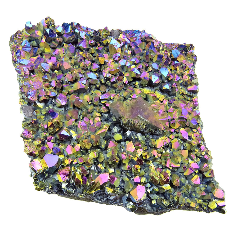 A rainbow aura crystal is a crystal with a colored tint. This is obtained by treating the crystal with a gold infusion. This is done in a vacuum chamber at a temperature of 871°C. Gold vapor is added to the chamber and the atoms fuse together with the surface of the crystal for a beautiful iridescent metallic sheen. This rainbow aura is an amethyst crystal.