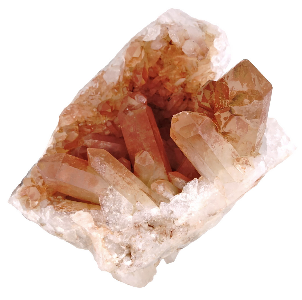 These crystals were found in Brazil and owe their color to the presence of hematite and water during growth. Hematite consists mainly of iron and iron oxides. In combination with water, hematite will rust, this process has given the quartz crystal its orange color.