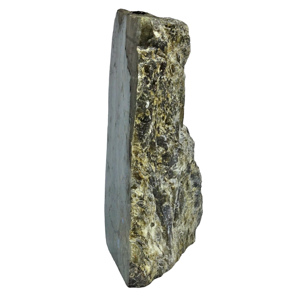 Labradoriet werd in 1780 voor het eerst ontdekt op het schiereiland Labrador in Canada. Het is een grijze steen die mooie kleurnuances in geel, groen en blauw vertoont als je hem draait. Dit kleurenspel wordt veroorzaakt door een interne lamellenstructuur, vaak in combinatie met kleine spiegelende insluitsels van rutiel en magnetiet. Deze steen behoort tot de veldspaat familie. Deze labradoriet heeft een gepolijste en een ruwe kant.