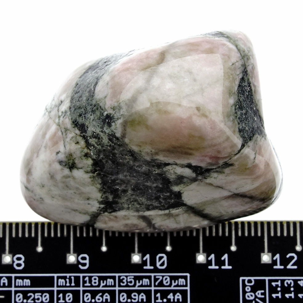 De roze ingesloten kristallen bestaan uit het mineraal clinozoisiet. Dit is een subgroep van epidoot en is verwant aan zoisiet. De roze kleur in combinatie met het zwarte moedergesteente maakt de steen uniek in zijn soort en wordt slechts op 1 plaats ter wereld gevonden.