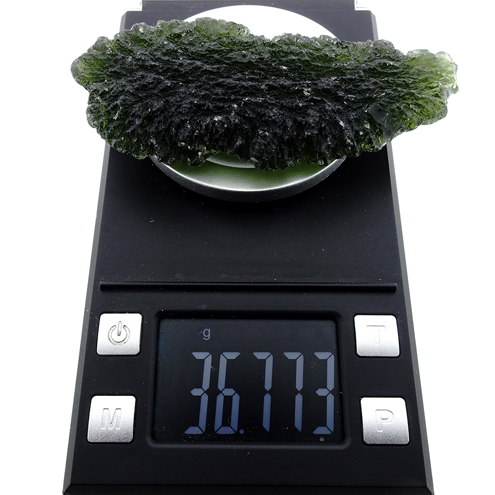 Deze moldaviet weegt 36,7 gram. Hij is niet geheel onbeschadigd en vertoont enkele kleine chipjes, zie foto's.