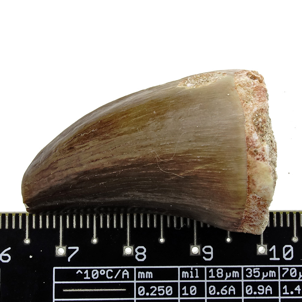 Een mooie tand van de Mosasaurus, een sauriër die in het late Krijt (71,3-65,4 mln jaar geleden) de zeeën bevolkte.
