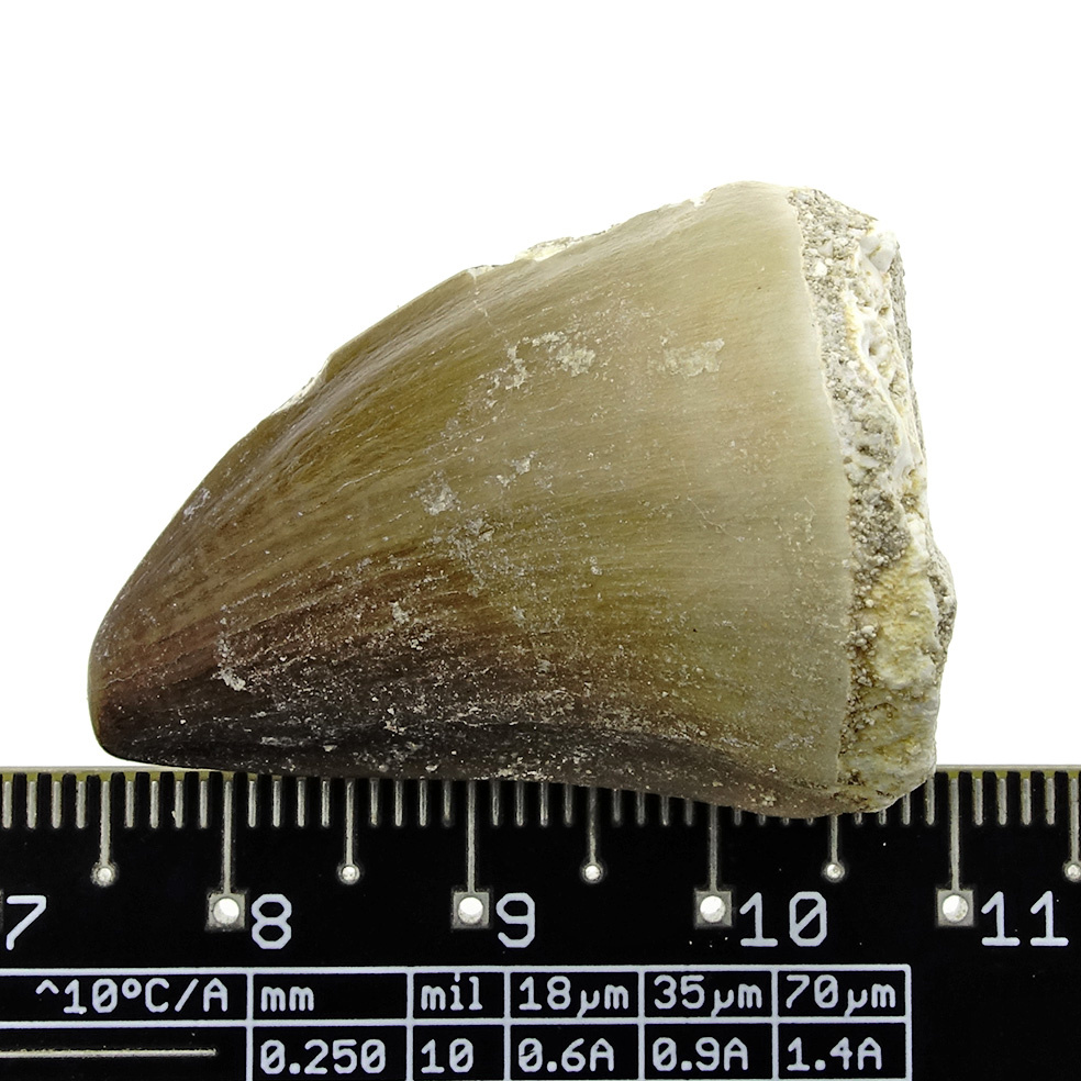 Een mooie tand van de Mosasaurus, een sauriër die in het late Krijt (71,3-65,4 mln jaar geleden) de zeeën bevolkte.