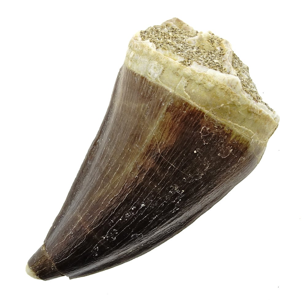 Een mooie tand van de Mosasaurus, een sauriër die in het late Krijt (71,3-65,4 mln jaar geleden) de zeeën bevolkte.