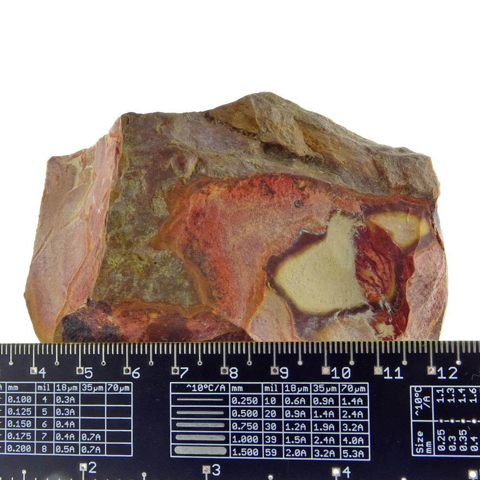 Jaspis is een ondoorzichtige variant van kwarts en agaat. Door de poreuze structuur kan jaspis veel vreemde bestandsdelen opnemen, dit verklaard ook de enorme variëteit aan kleuren die jaspis kan hebben. Deze polychroom jaspis is aan 1 kant gepolijst, de andere kant is ruw.