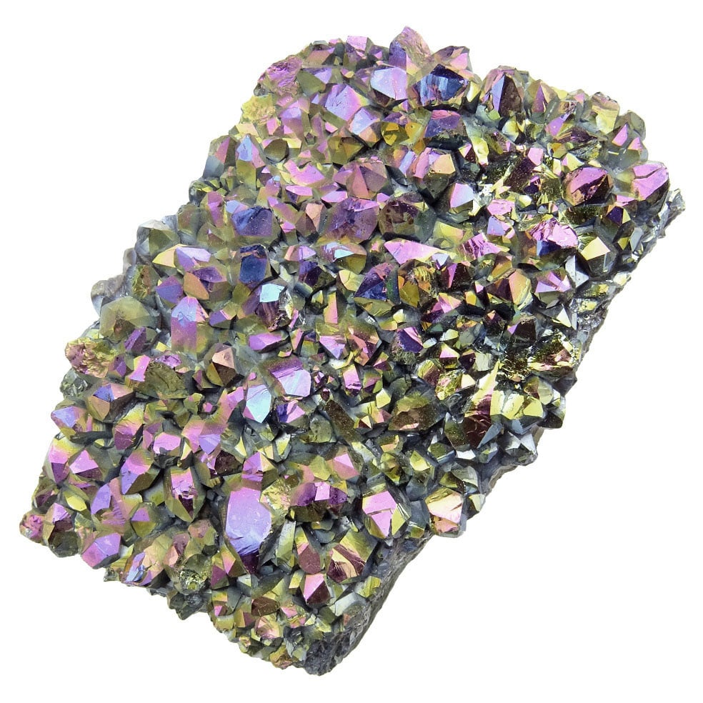 Een regenboog aura kristal is een kristal met een gekleurde tint. Deze is verkregen door het kristal te behandelen met een goud infusie. Dit gebeurt in een vacuümkamer bij een temperatuur van 871°C. Gouddamp wordt aan de kamer toegevoegd en de atomen versmelten samen met het oppervlak van het kristal voor een mooie iriserende metaalglans. Deze regenboog aura is een amethist kristal.
