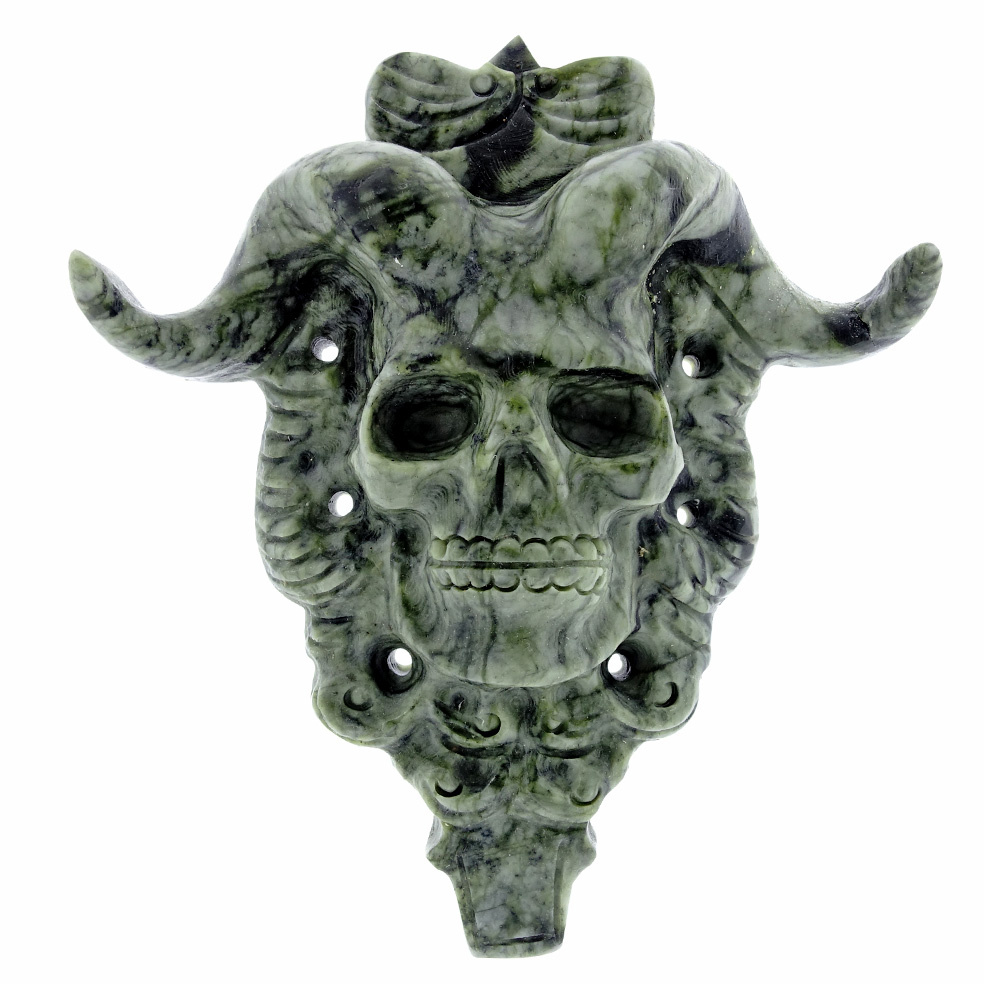 Mooie serpentijn skull met hoorns, Deze skull is volledig plat aan de achterkant. De hoorn aan de rechterkant is gelijmd, vandaar B kwaliteit.