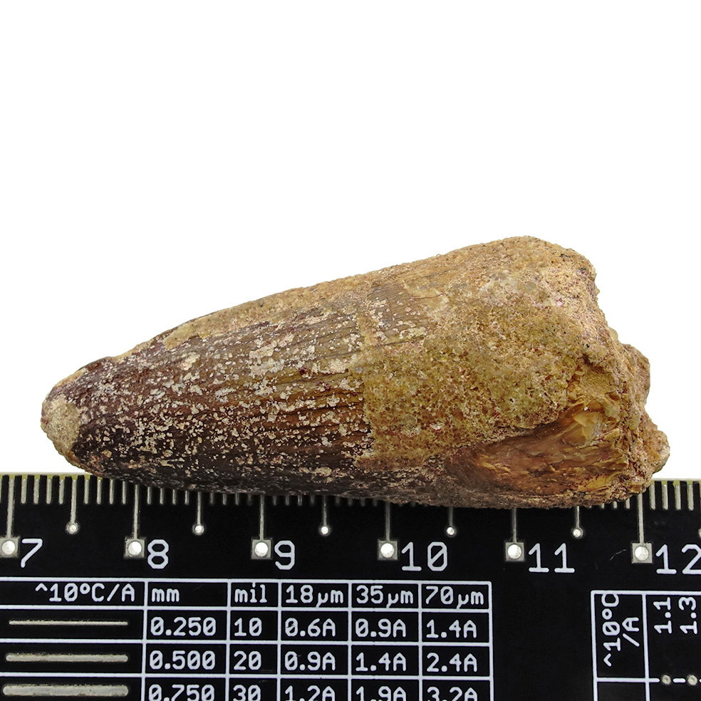 Fraaie tand van het grootste landroofdier dat ooit geleefd heeft. De spinosaurus kon wel 15 meter lang worden! Dat is 3 meter langer dan de T-rex. Recent onderzoek heeft uitgewezen dat de Spinosaurus ook een prima zwemmer was, dat zou ook de enorme kam op de rug van het dier verklaren.