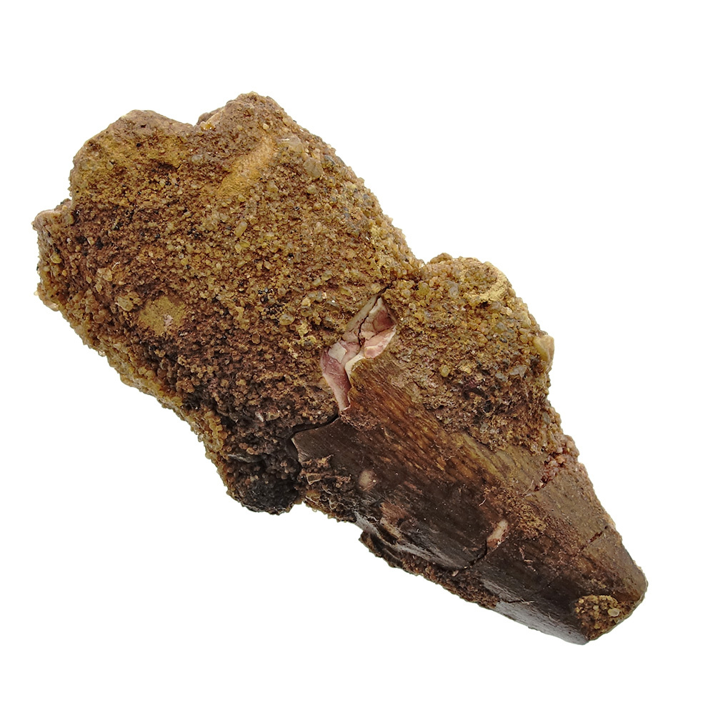 Fraaie tand van het grootste landroofdier dat ooit geleefd heeft. De spinosaurus kon wel 15 meter lang worden! Dat is 3 meter langer dan de T-rex. Recent onderzoek heeft uitgewezen dat de Spinosaurus ook een prima zwemmer was, dat zou ook de enorme kam op de rug van het dier verklaren.