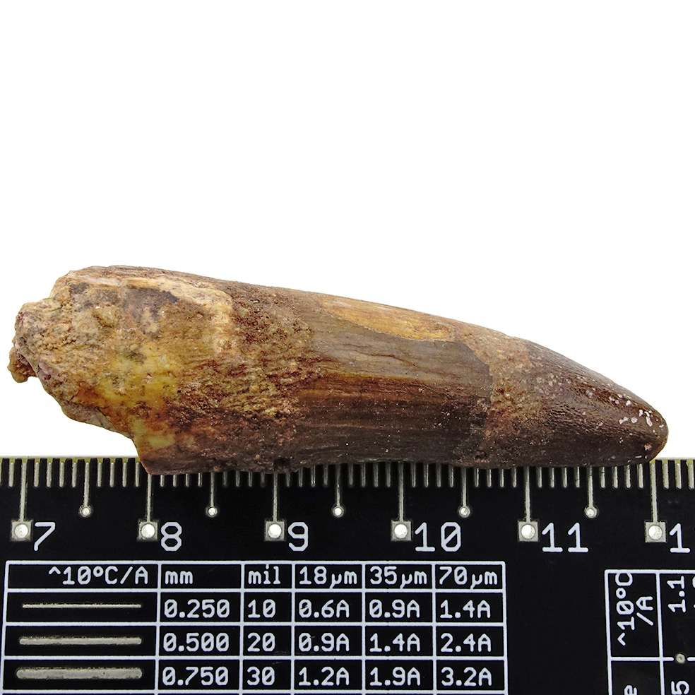 Fraaie tand van het grootste landroofdier dat ooit geleefd heeft. De spinosaurus kon wel 15 meter lang worden! Dat is 3 meter langer dan de T-rex.  Recent onderzoek heeft uitgewezen dat de Spinosaurus ook een prima zwemmer was, dat zou ook de enorme kam op de rug van het dier verklaren.