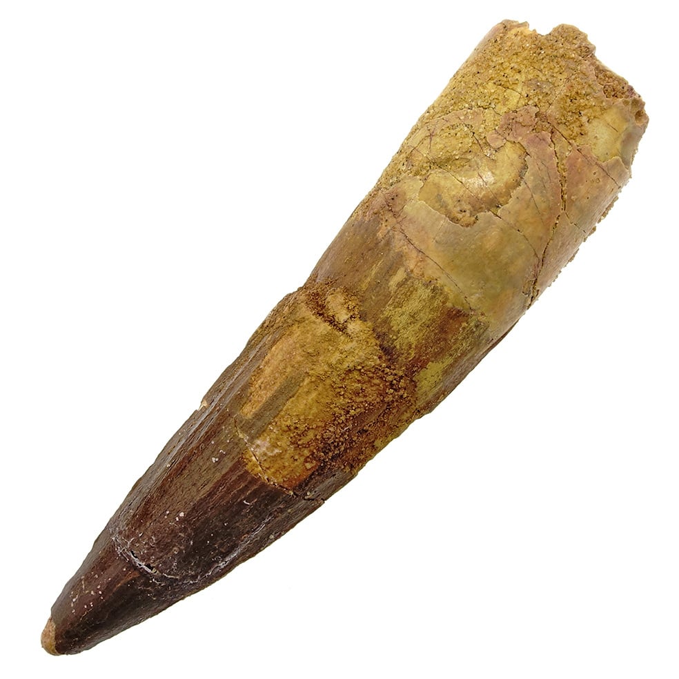 Fraaie tand van het grootste landroofdier dat ooit geleefd heeft. De spinosaurus kon wel 15 meter lang worden! Dat is 3 meter langer dan de T-rex.  Recent onderzoek heeft uitgewezen dat de Spinosaurus ook een prima zwemmer was, dat zou ook de enorme kam op de rug van het dier verklaren.