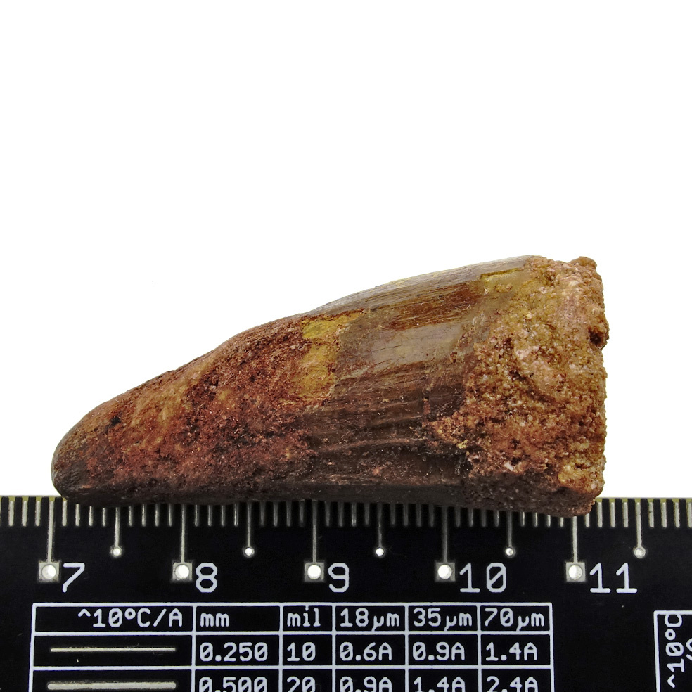 Fraaie tand van het grootste landroofdier dat ooit geleefd heeft. De spinosaurus kon wel 15 meter lang worden! Dat is 3 meter langer dan de T-rex. Recent onderzoek heeft uitgewezen dat de Spinosaurus ook een prima zwemmer was, dat zou ook de enorme kam op de rug van het dier verklaren.