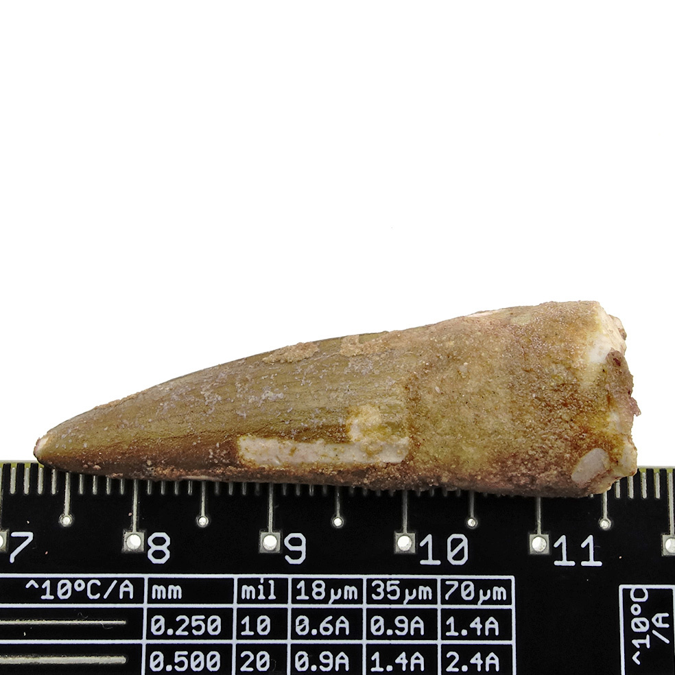 Fraaie tand van het grootste landroofdier dat ooit geleefd heeft. De spinosaurus kon wel 15 meter lang worden! Dat is 3 meter langer dan de T-rex. Recent onderzoek heeft uitgewezen dat de Spinosaurus ook een prima zwemmer was, dat zou ook de enorme kam op de rug van het dier verklaren.