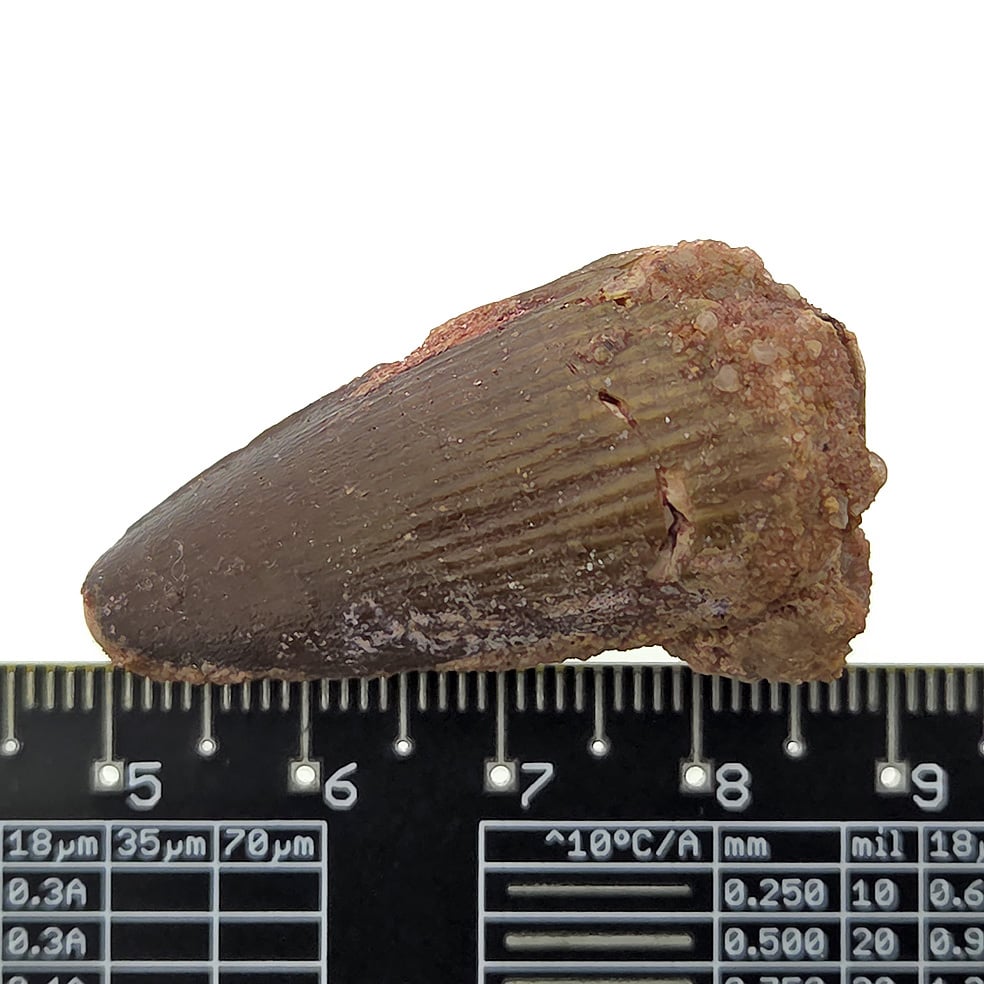 De puntige vorm van deze tand laat goed zien waarvoor hij diende: prooien grijpen en vasthouden. De bek van Spinosaurus wordt vaak vergeleken met die van moderne krokodillen, wat goed past bij het idee dat hij veel in en rond het water jaagde. Tanden als deze zijn stevig, maar blijven fossielen en moeten daarom met zorg behandeld worden.