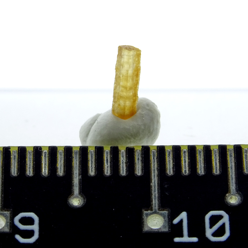 Let op, dit bijzondere kristal is zeer klein! Kijk goed bij de foto met de liniaal. De Vayryneniet wordt verzonden in een edelsteendoosje van 2,5 x 2,5 cm